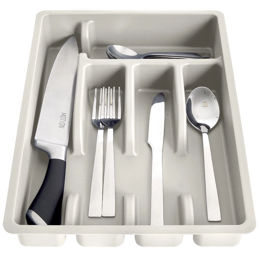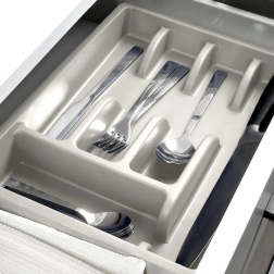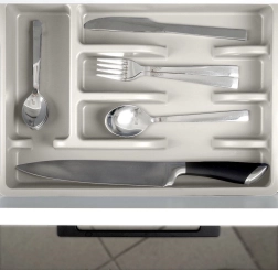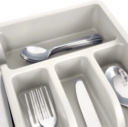 Trei secțiuni pentru tacâmuri, un compartiment separat pentru lingurițe și o zonă lungă pentru ustensile de bucătărie păstrează totul clar organizat la locul său.