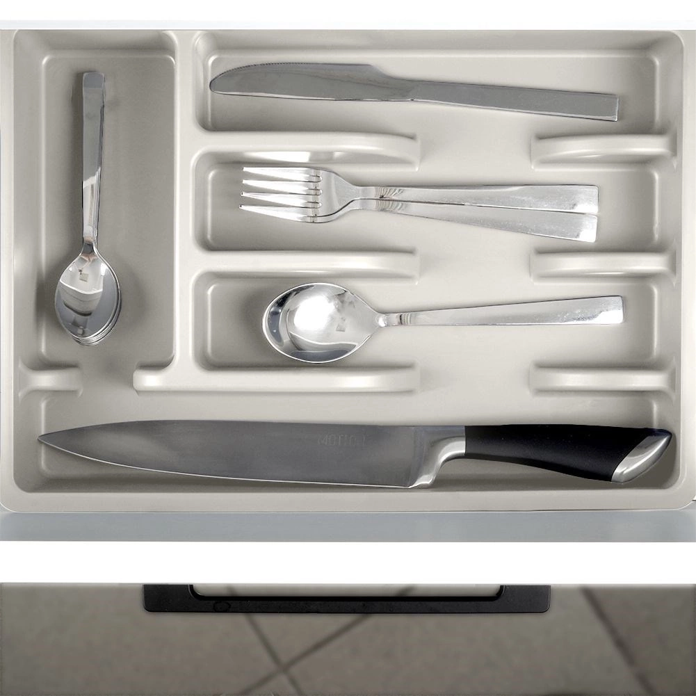 Inserția oferă cinci compartimente funcționale: trei pentru tacâmuri de bază, unul pentru lingurițe de ceai și unul lung pentru tel, răzuitoare sau cuțite în teacă. Suprafața netedă se curăță ușor și este potrivită pentru mașina de spălat vase, astfel încât întreținerea este rapidă și fără griji.