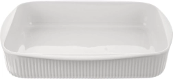 Vas de copt din porțelan alb, practic, cu un volum de 2,2 l și dimensiuni de 30,5 × 24,5 × 5,5 cm, pentru coacere și servire zilnică. Fabricat din porțelan de calitate într-o fabrică tradițională de porțelan din regiunea Karlovy Vary, potrivit pentru cuptor, cuptor cu microunde, frigider și mașina de spălat vase. Suprafață exterioară striatiă, interior glazurat neted pentru o desprindere și curățare ușoară și mânere laterale integrate pentru transport confortabil.