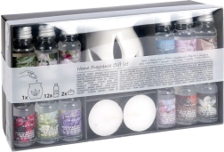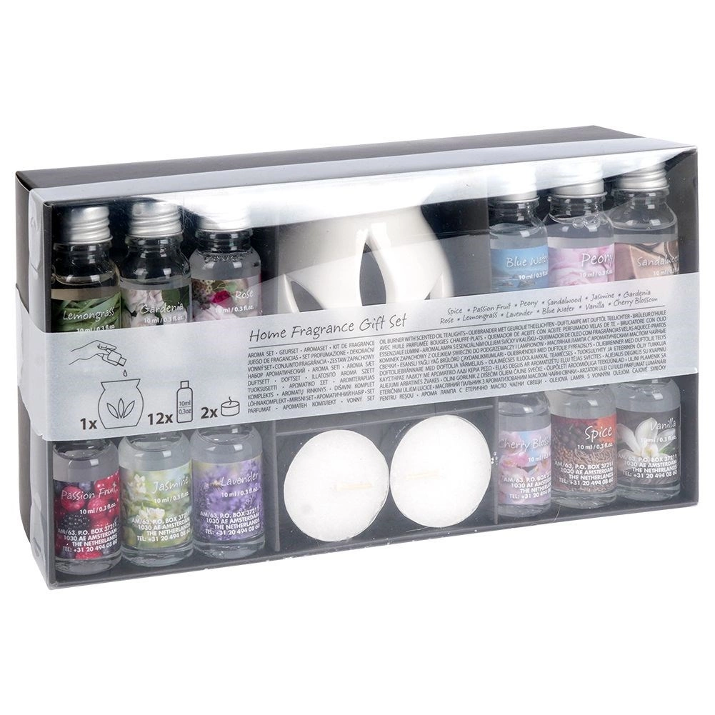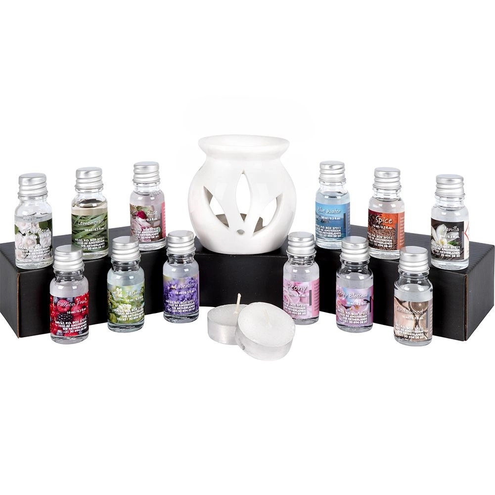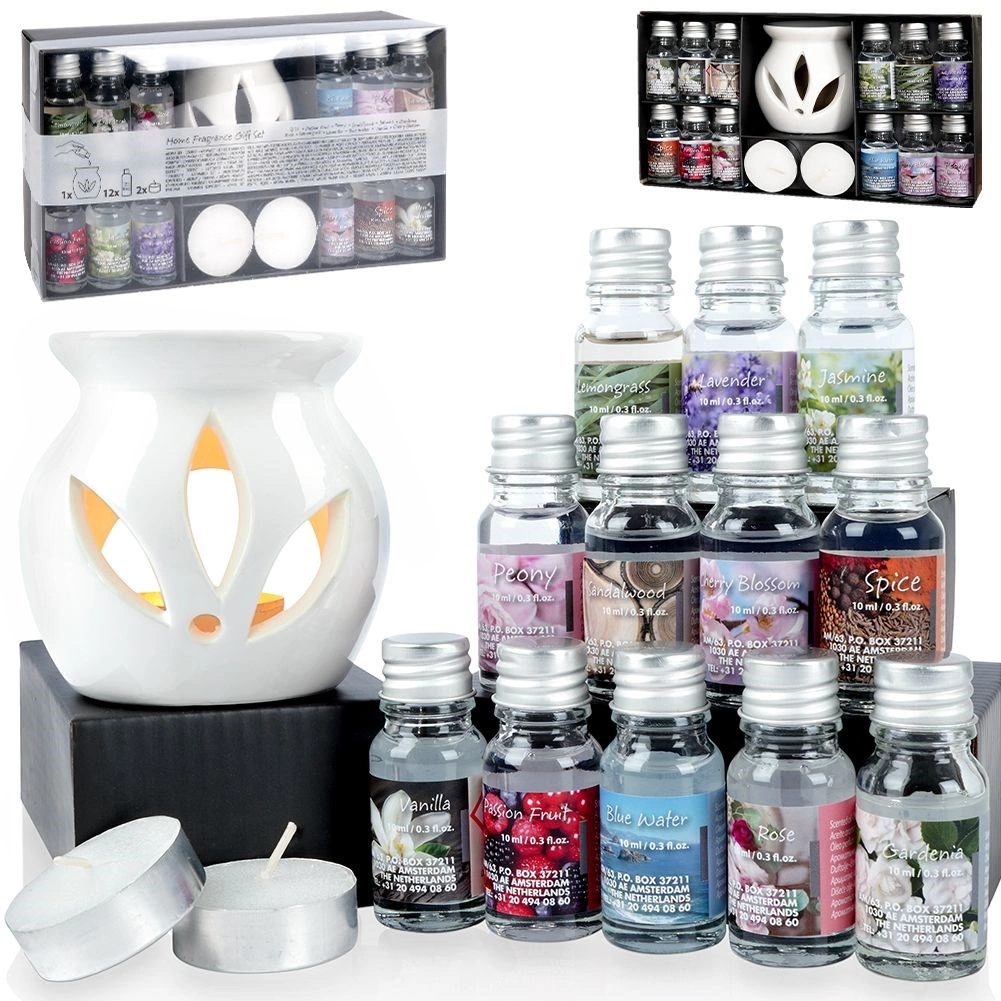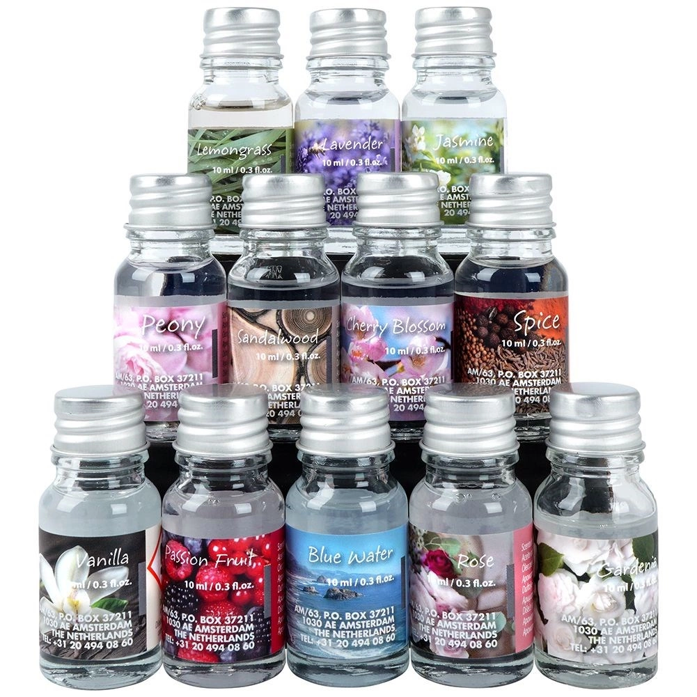 - 12× ulei parfumat 10 ml: Spice, Passion Fruit, Peony, Sandalwood, Jasmine, Gardenia, Rose, Lemongrass, Lavender, Blue Water, Vanilla, Cherry Blossom