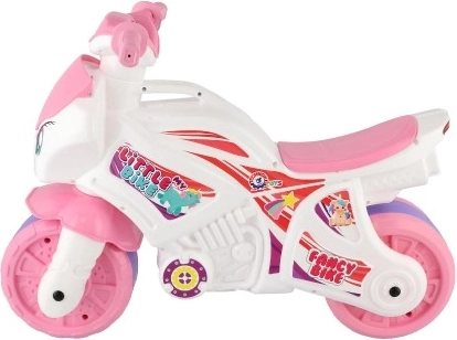 Această frumoasă motocicletă pentru copii este ideală pentru cei mai mici. Este echipată cu roți late care asigură stabilitate și o deplasare ușoară. Datorită materialului plastic de calitate, este rezistentă și face față utilizării solicitante. În plus, motocicleta este împodobită cu autocolante frumoase și colorate, care îi sporesc atractivitatea.