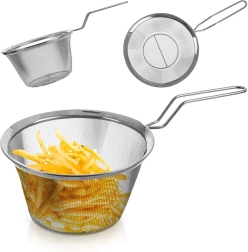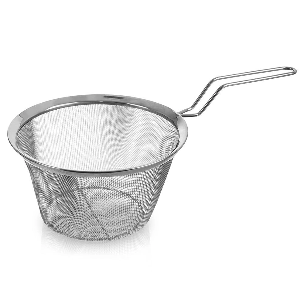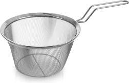 Coș metalic practic pentru prăjire profundă, scurgerea pastelor și legumelor și ca inserție pentru gătit la abur. Are plasă fină din inox, cadru solid și mâner lung pentru manipulare în siguranță. Poate fi spălat în mașina de spălat vase.