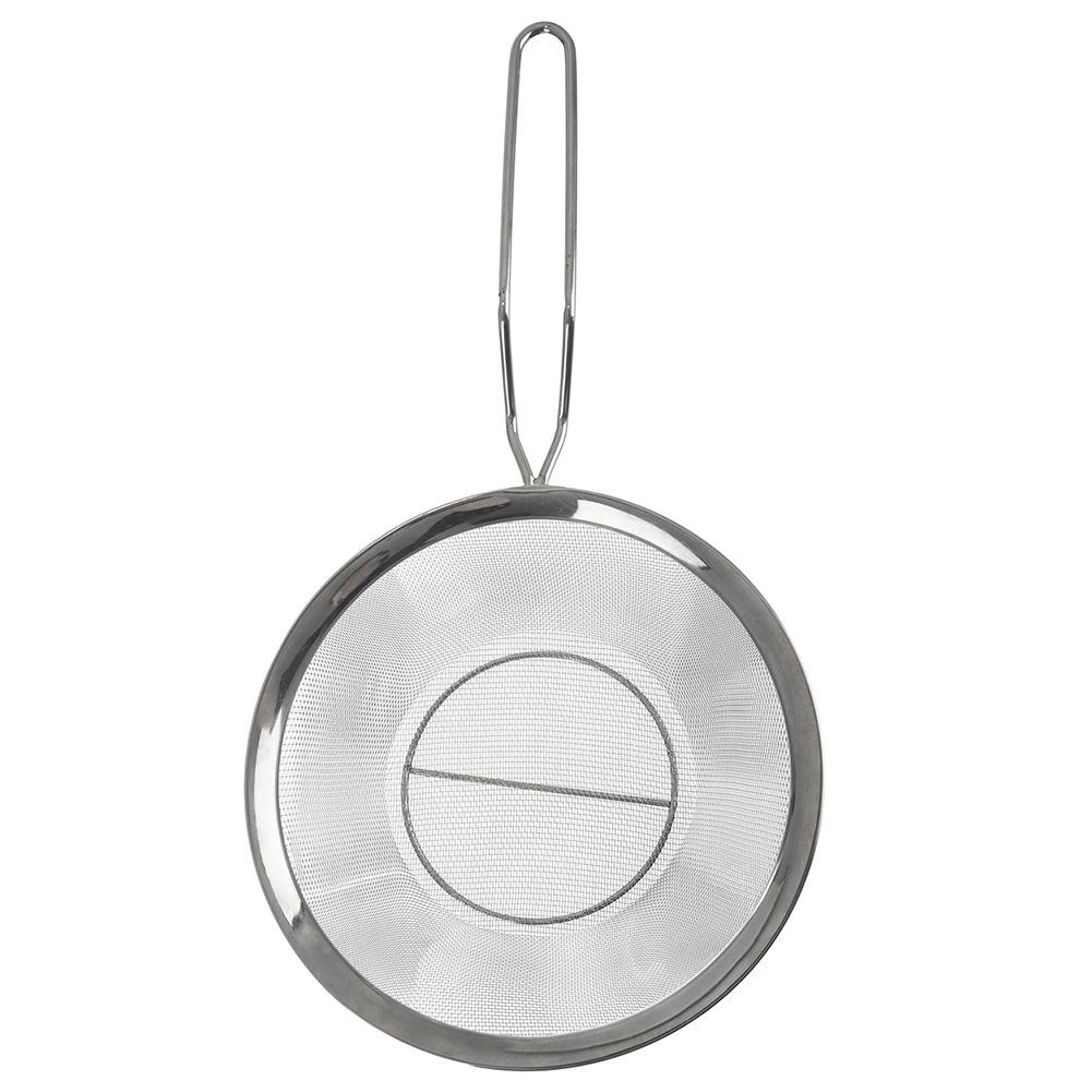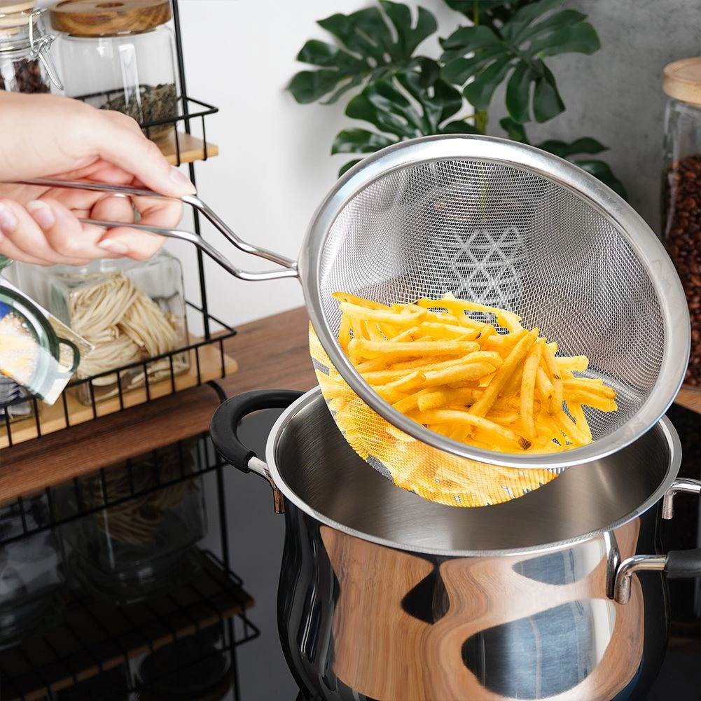 Plasa fină din oțel inoxidabil evacuează rapid apa din paste, legume și cartofi prăjiți și împiedică trecerea bucăților mici.