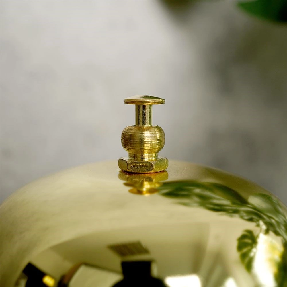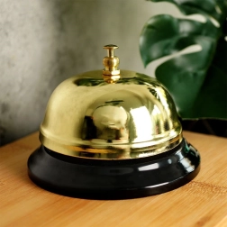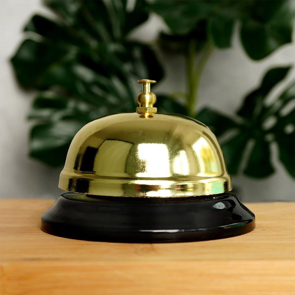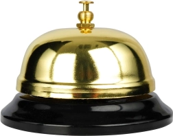 Clopoțelul de masă auriu, elegant, este potrivit pentru tejghele, recepții și case de marcat. Datorită dimensiunilor compacte de 8,5 × 6 cm, ocupă puțin spațiu, dar cheamă personalul în mod fiabil. Designul minimalist în culoare aurie cu bază neagră se potrivește ușor cu orice interior.