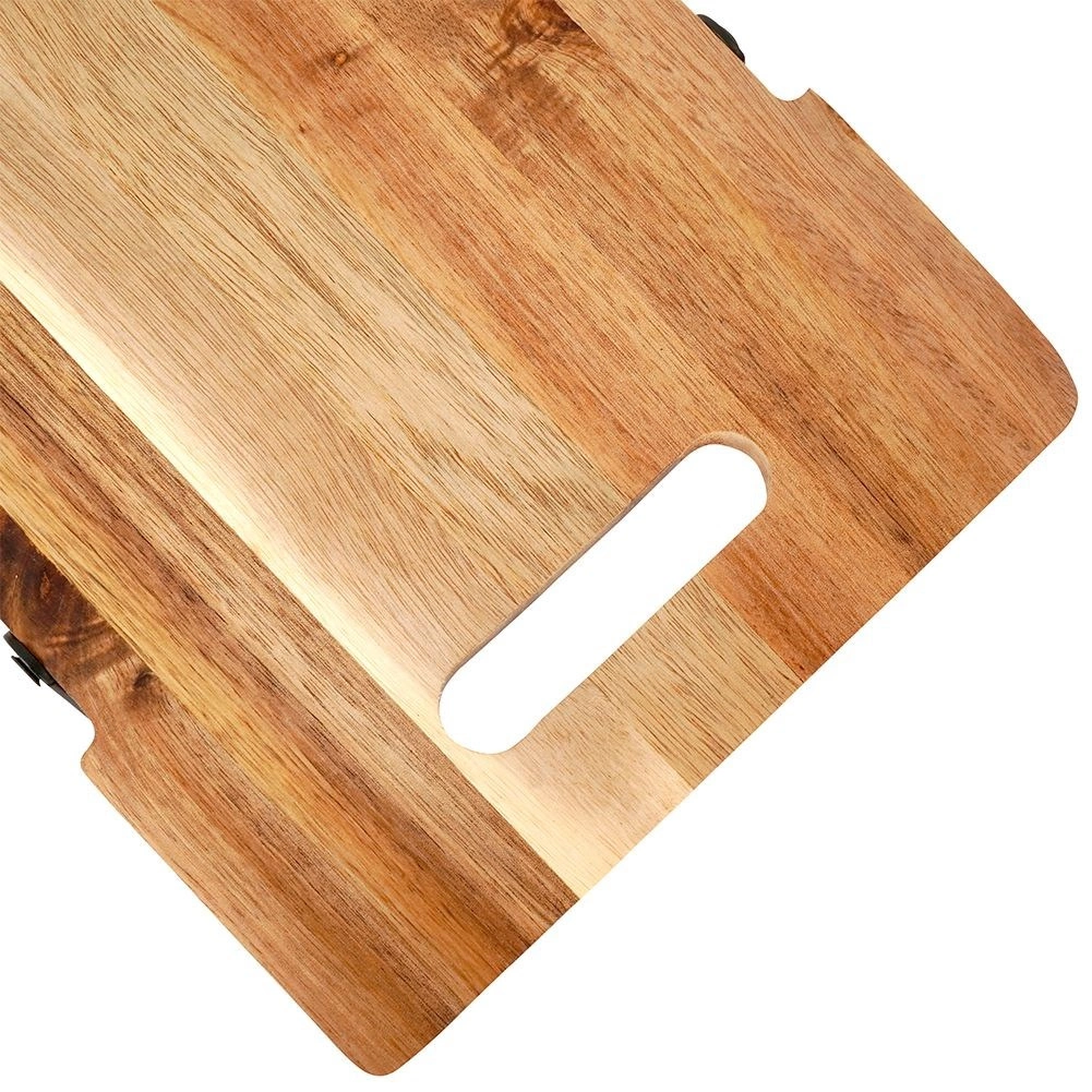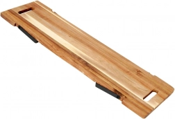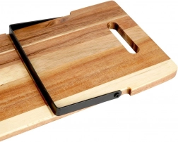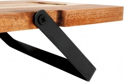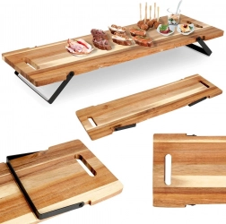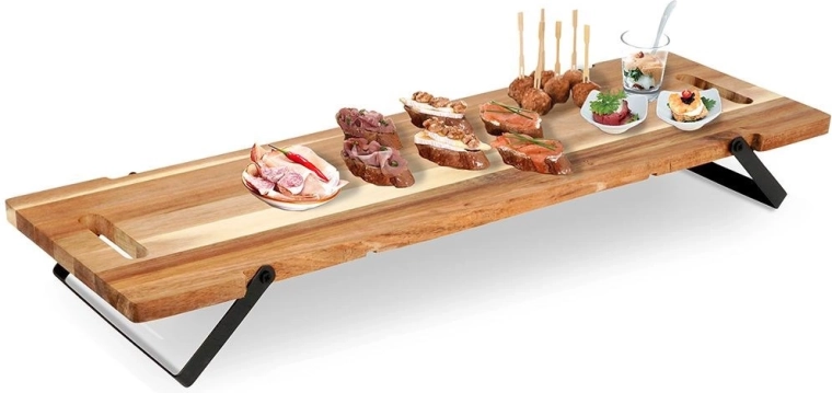 Această tavă lungă de servire din lemn de salcâm, cu picioare metalice pliabile, va ridica prezentarea preparatelor la un nou nivel. Mânerele integrate pe laterale asigură un transport comod și sigur, iar poziția înălțată facilitează preluarea și menține masa ordonată.