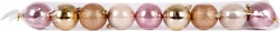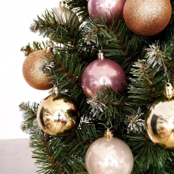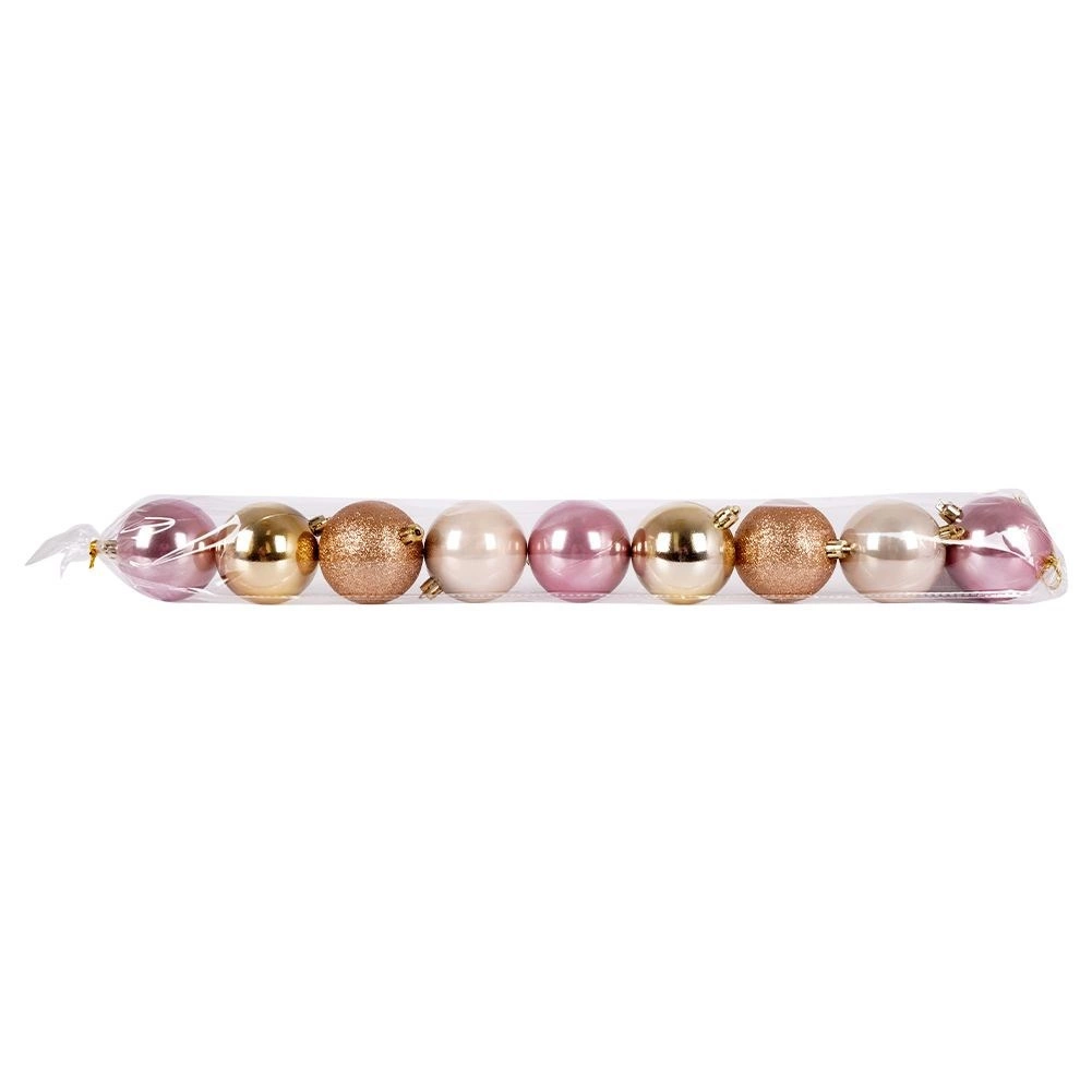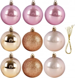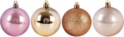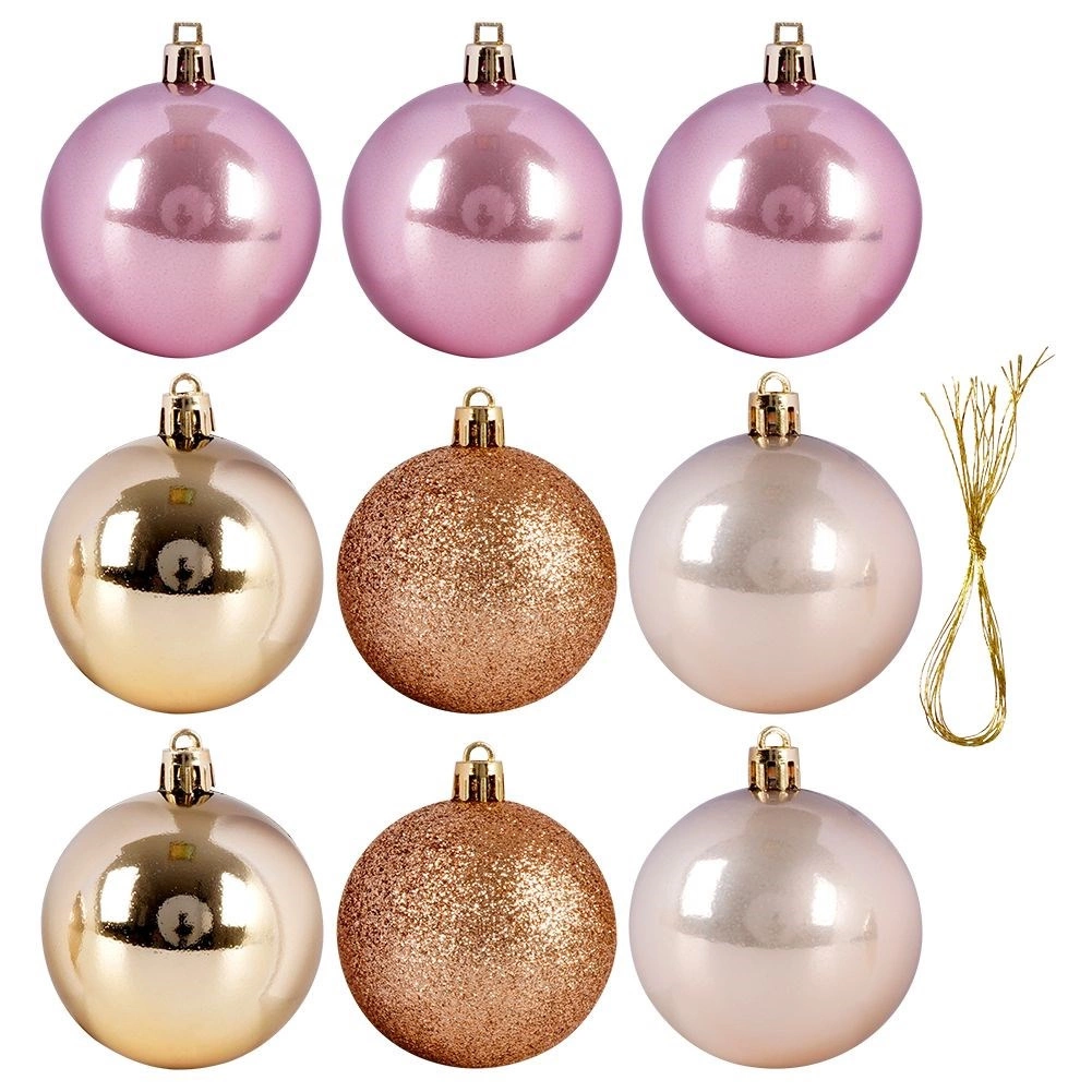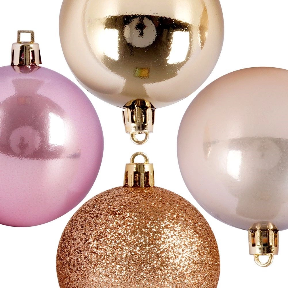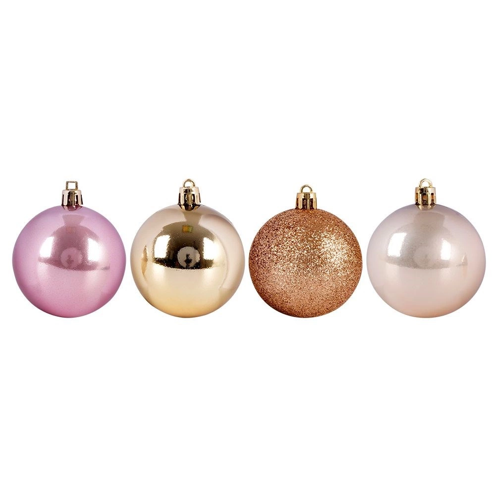 Globuri lucioase, mate și sclipitoare în tonuri de roz, perlat și auriu creează o paletă festivă elegantă și echilibrată.