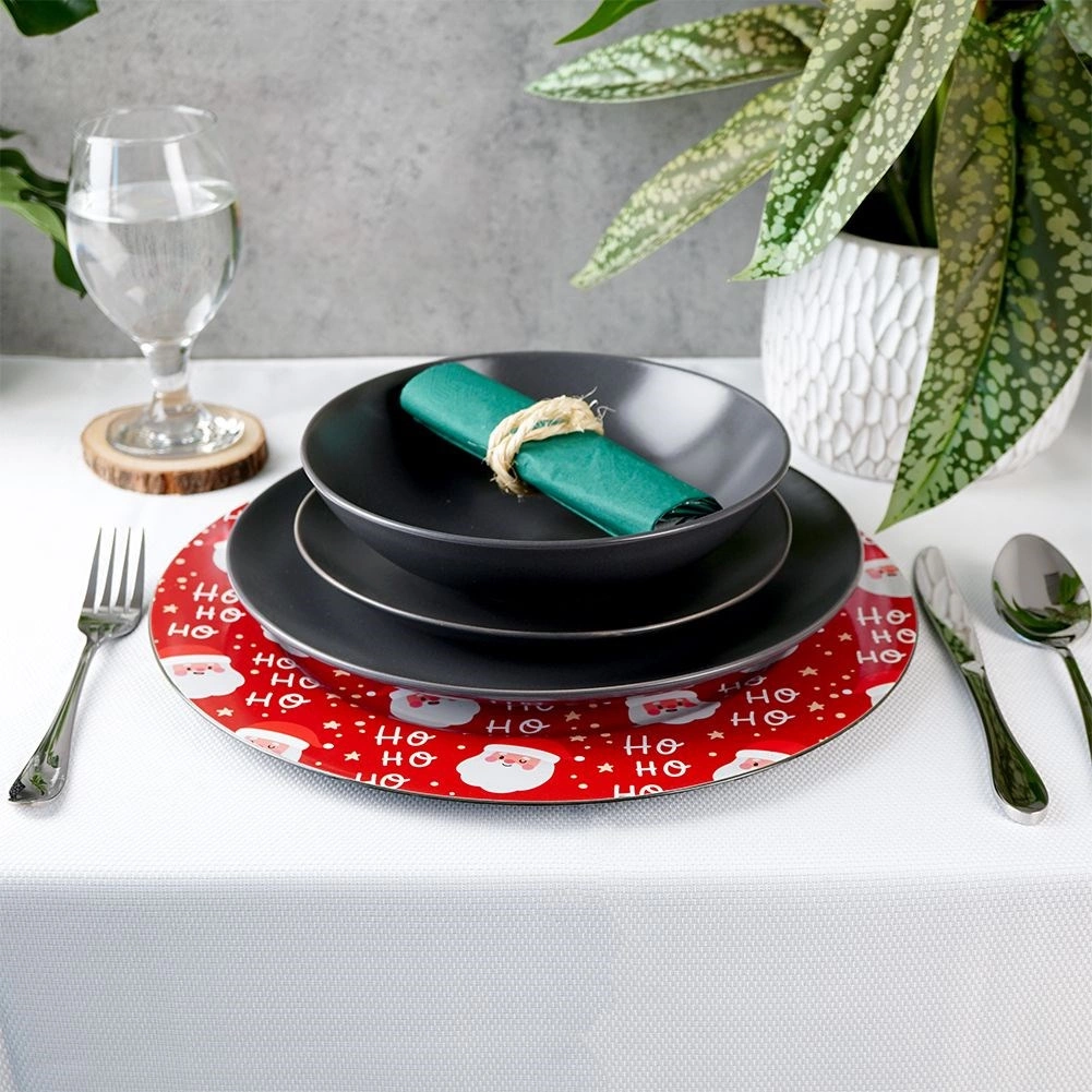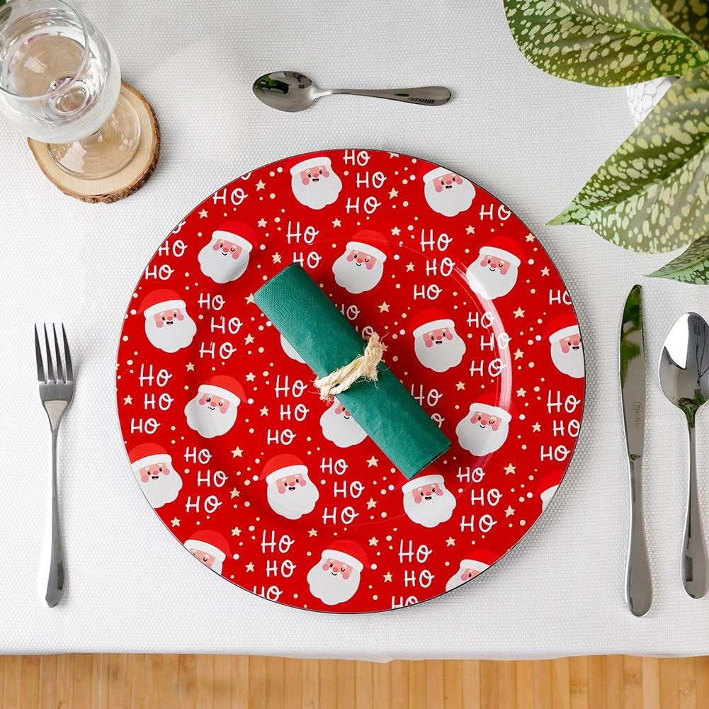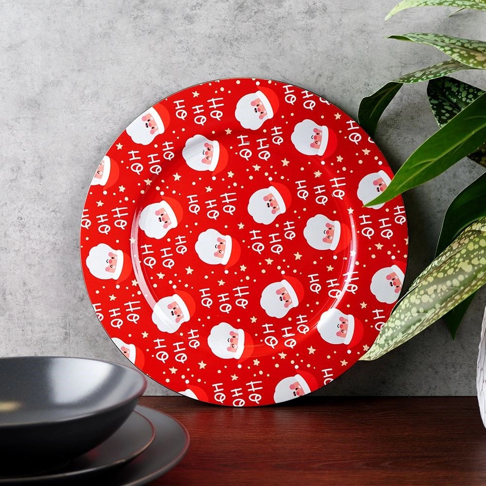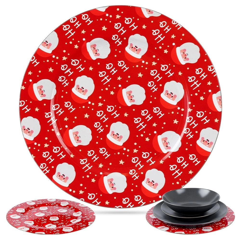 Suport roșu elegant pentru farfurie, cu diametrul de 33 cm și motiv vesel cu MOȘ CRĂCIUN, care oferă mesei tale o atmosferă festivă. Fabricat din plastic rezistent, este ideal atât ca farfurie decorativă de prezentare, cât și ca tavă de servire. Datorită formei universale rotunde, arată minunat sub orice farfurie și te ajută să creezi o masă deosebită de Crăciun.