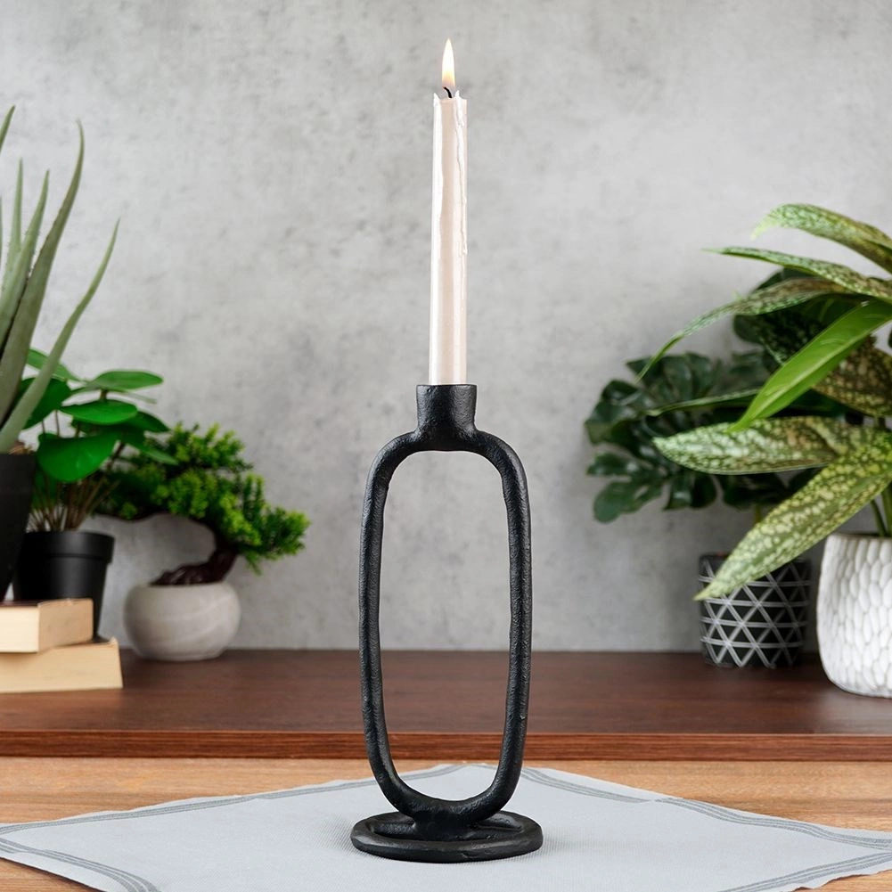 Sfeșnicul modern negru din aluminiu pentru lumânare lungă adaugă interiorului eleganță și un stil minimalist. Are o bază circulară stabilă, se potrivește în decor loft/industrial cât și clasic și arată excelent pe masă, comodă sau raft.