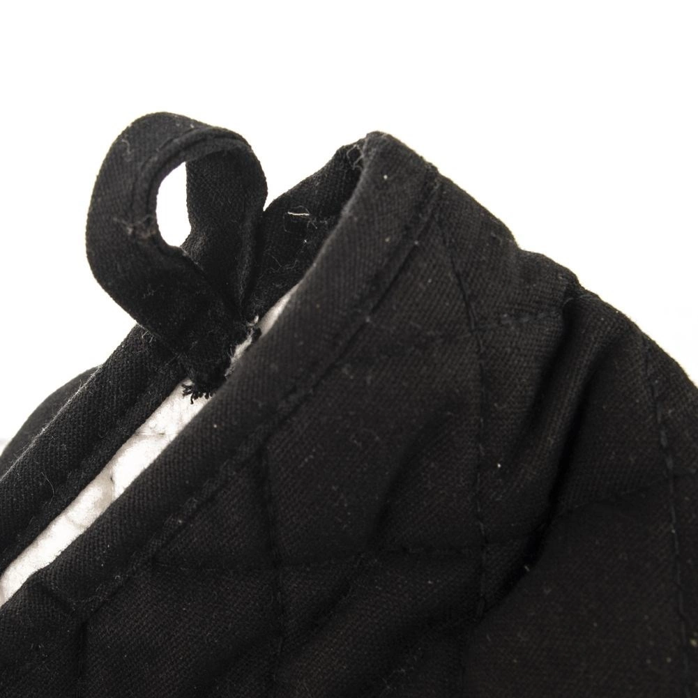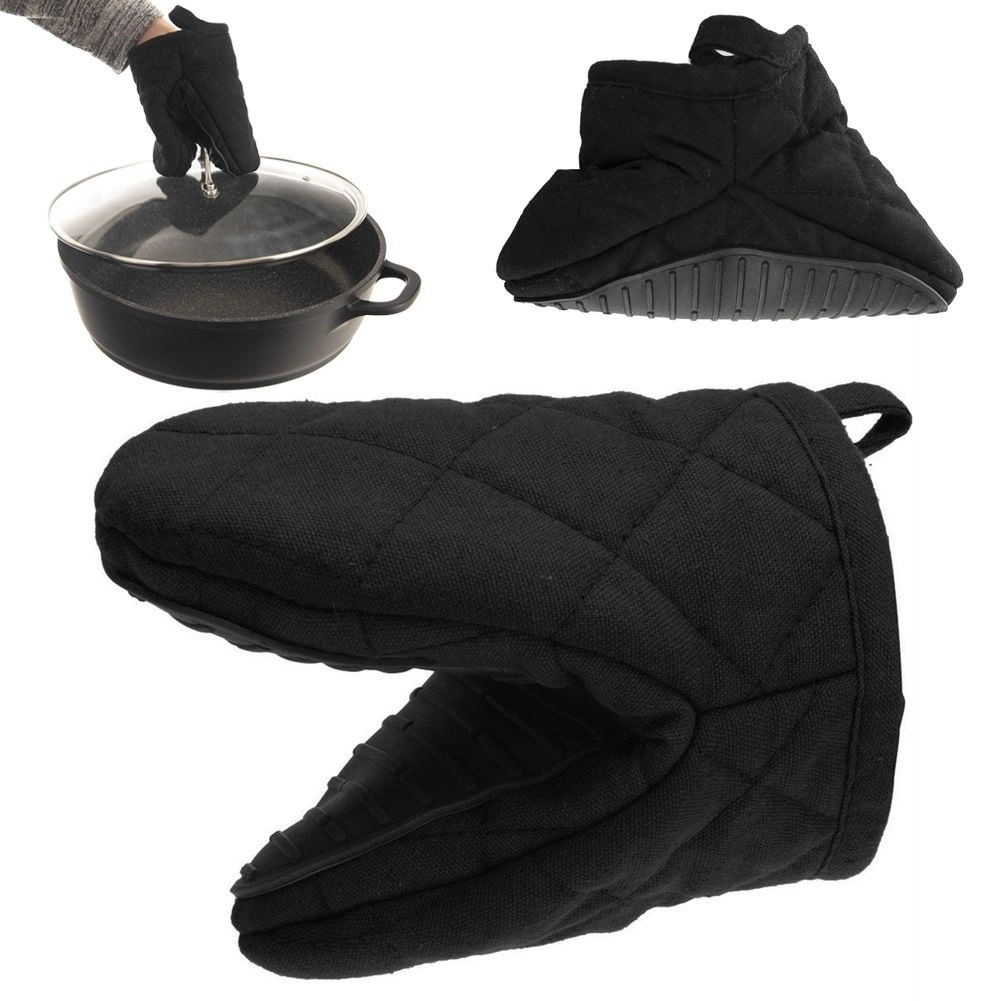 Această mănușă de bucătărie rezistentă, în elegantul negru, combină bumbacul moale cu un strat din silicon antiderapant pe partea interioară pentru o prindere sigură. Este ideală pentru gătitul și coptul de zi cu zi, protejând palmele la manipularea tăvilor, vaselor de copt și oalelor fierbinți.