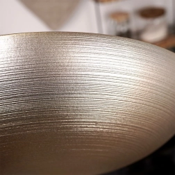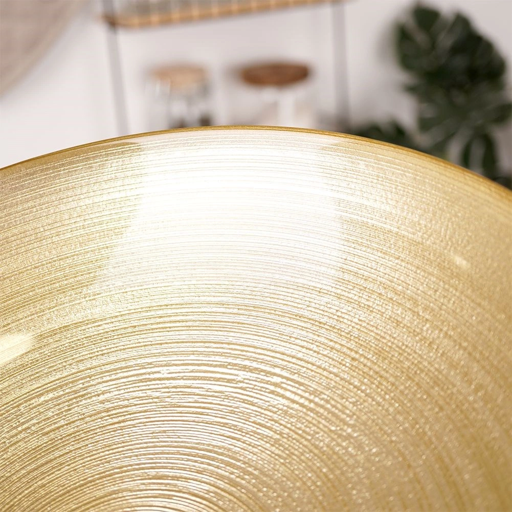Bol elegant din sticlă, finisaj auriu, cu diametrul de 30 cm și volum de 2,2 l. Ideal pentru salate, fructe și servirea preparatelor. Suprafața exterioară mată cu dungi orizontale fine are un efect decorativ și adaugă stil mesei. Utilizare universală, aspect de efect și dimensiune practică fac din acest bol un ajutor excelent pentru ocazii zilnice și festive.