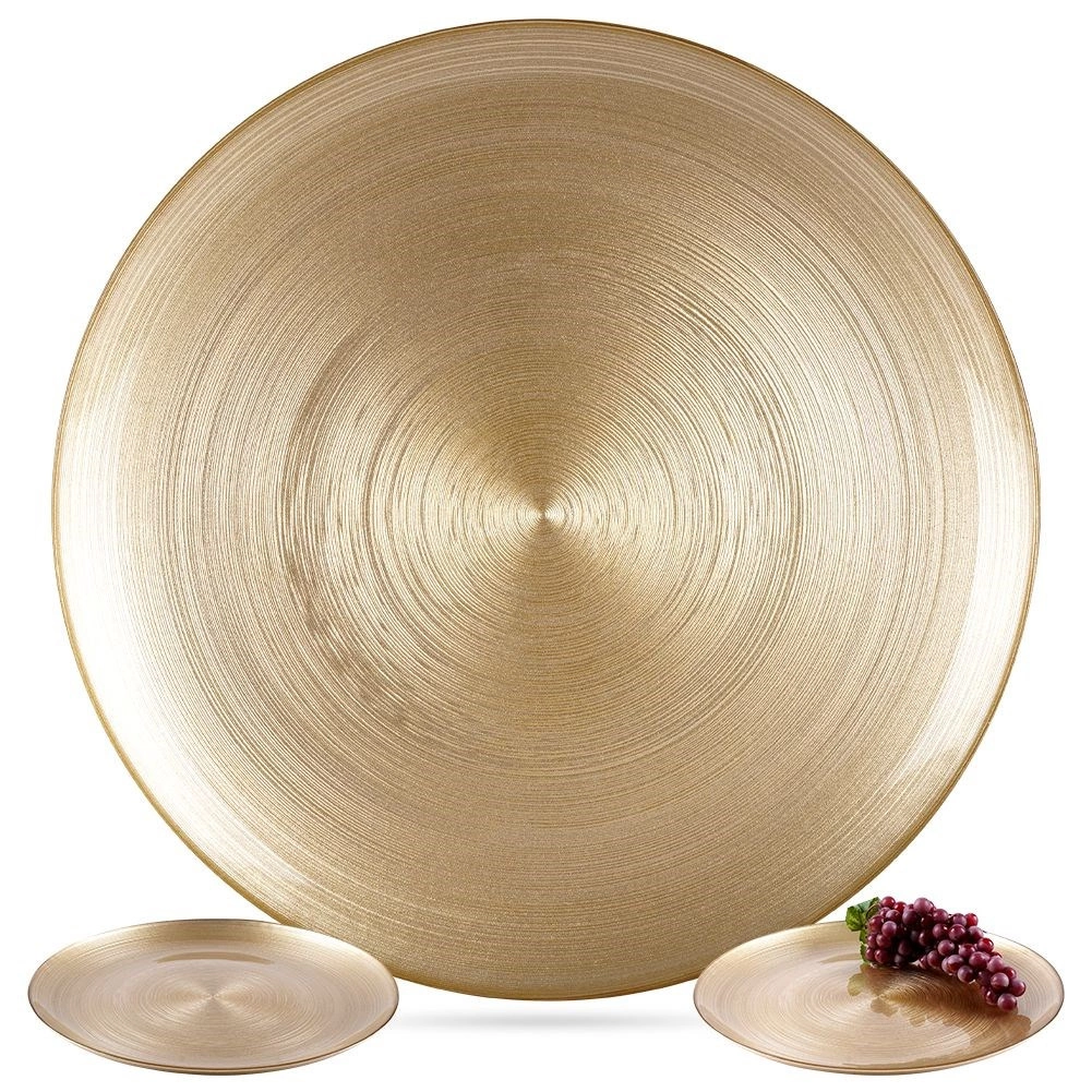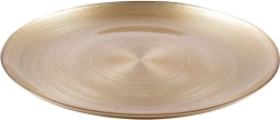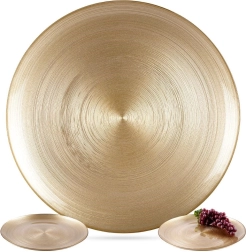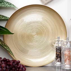 Farfurie întinsă elegantă, cu diametrul de 32,5 cm, în culoare aurie luxoasă, ideală atât pentru mesele zilnice, cât și pentru ocazii festive. Fabricată din sticlă de calitate, cu spate mat stilat cu dungi fine, oferă utilizare universală pentru mic dejun, prânz, deserturi și ca platou de servire pentru aperitive. Datorită suprafeței netede se curăță ușor și completează perfect orice masă clasică sau modernă.