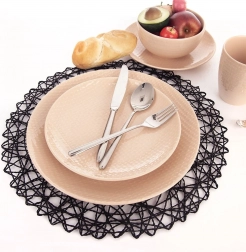 Decorațiune elegantă pentru masă, sub forma unui suport rotund din hârtie de culoare neagră, care oferă mesei un aspect modern și rafinat. Structura ce amintește de dantelă este foarte decorativă și se evidențiază sub farfurii, precum și sub accesorii din sticlă sau ceramică.