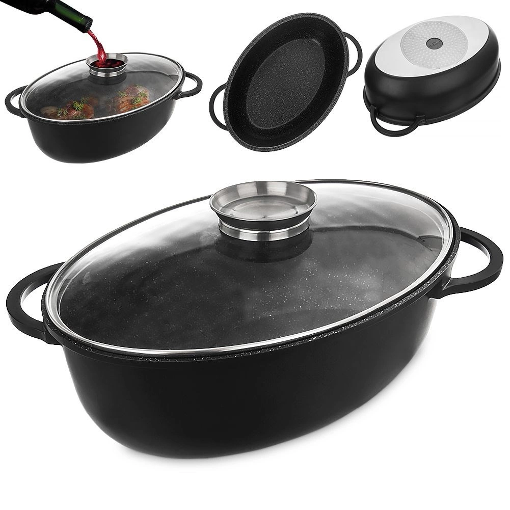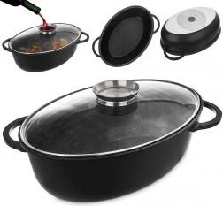 Această tavă ovală este ideală pentru coacere, înăbușire și gratinare a porțiilor mai mari de carne, legume și mâncăruri pentru familie. Datorită stratului antiaderent din granit PFLUON GRANIT, pregătiți mâncăruri cu mai puțin ulei, iar curățarea este rapidă și ușoară. Capacul din sticlă permite controlul procesului de gătire, iar dozatorul integrat în capac facilitează stropirea cu apă, vin sau sos fără a ridica capacul.