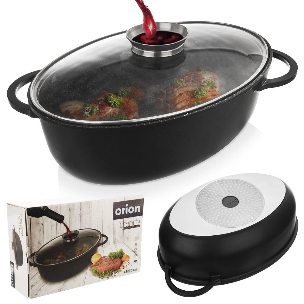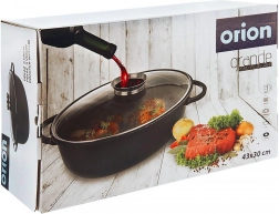 În pachet găsiți 1× tavă ovală adâncă (dimensiuni exterioare 45 × 27,5 × 13 cm, dimensiuni interioare 37,5 × 25 × 13 cm, volum 8 l) și 1× capac din sticlă (dimensiuni exterioare 39 × 26,5 × 7 cm). ORION – produs original al mărcii cehe, fabricat în conformitate cu standardele europene.