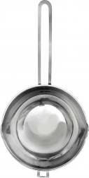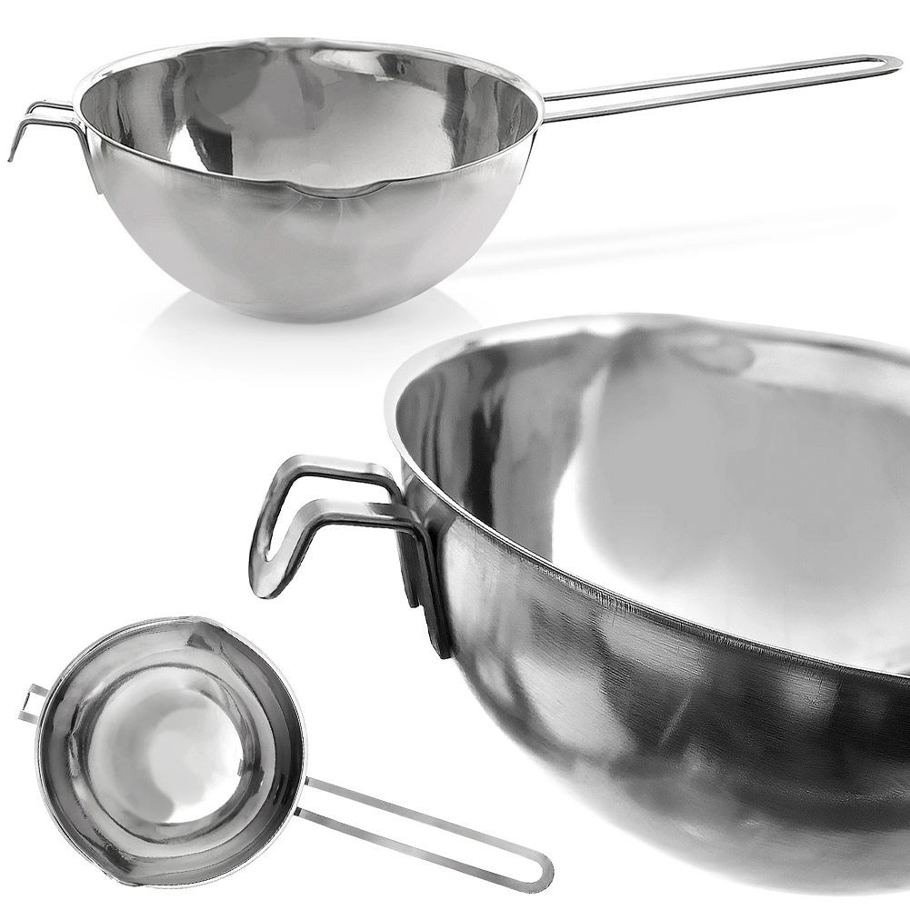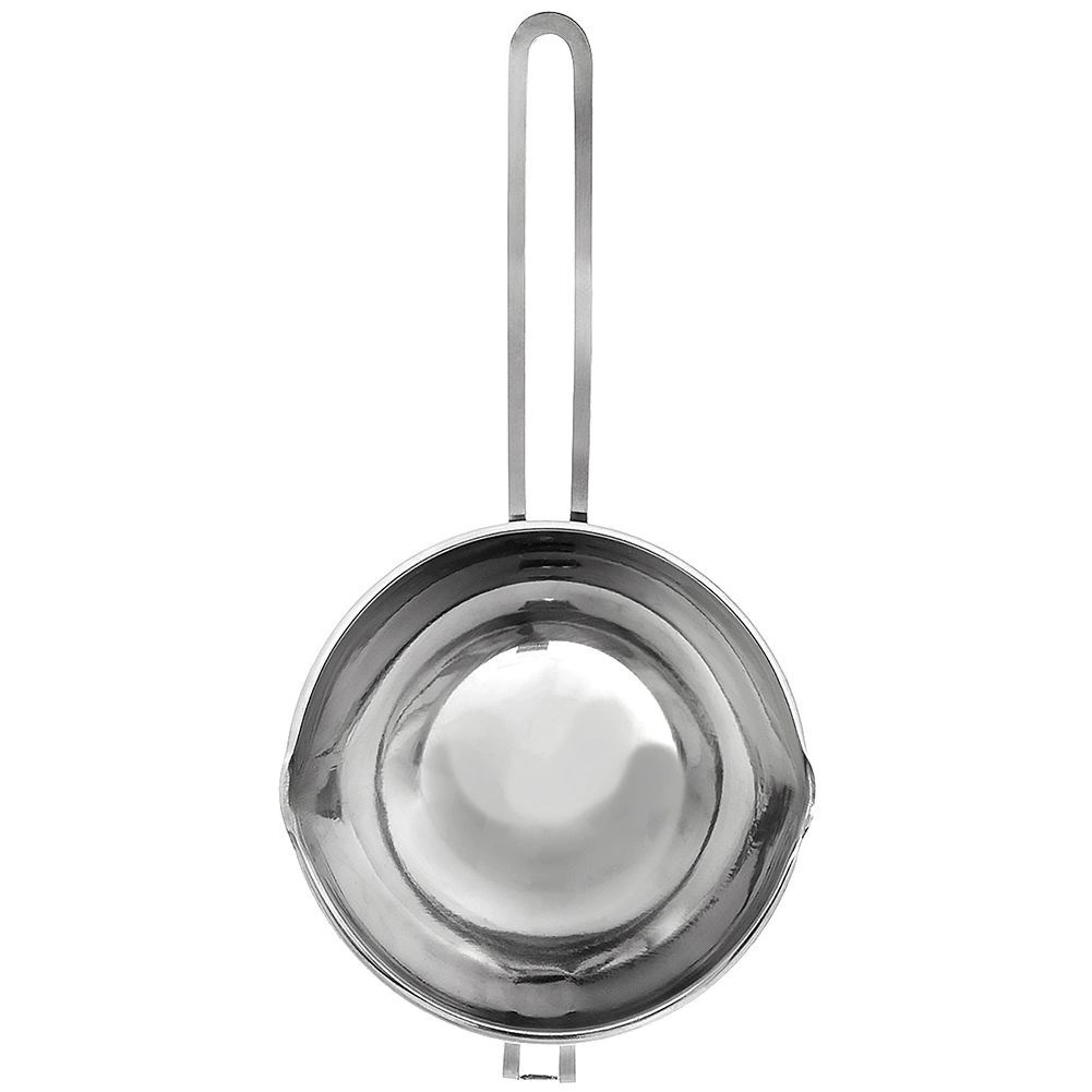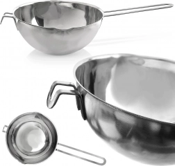 Acest bol din inox pentru baie de apă este conceput pentru încălzirea precisă și delicată a ingredientelor, fără riscul arderii. Este perfect pentru cofetarii casnici și pentru iubitorii de lumânări artizanale – îl puteți folosi pentru topirea ciocolatei, a untului și a cerii. Mânerul lung asigură o prindere sigură, iar cârligul permite așezarea fermă a bolului pe marginea oalei.