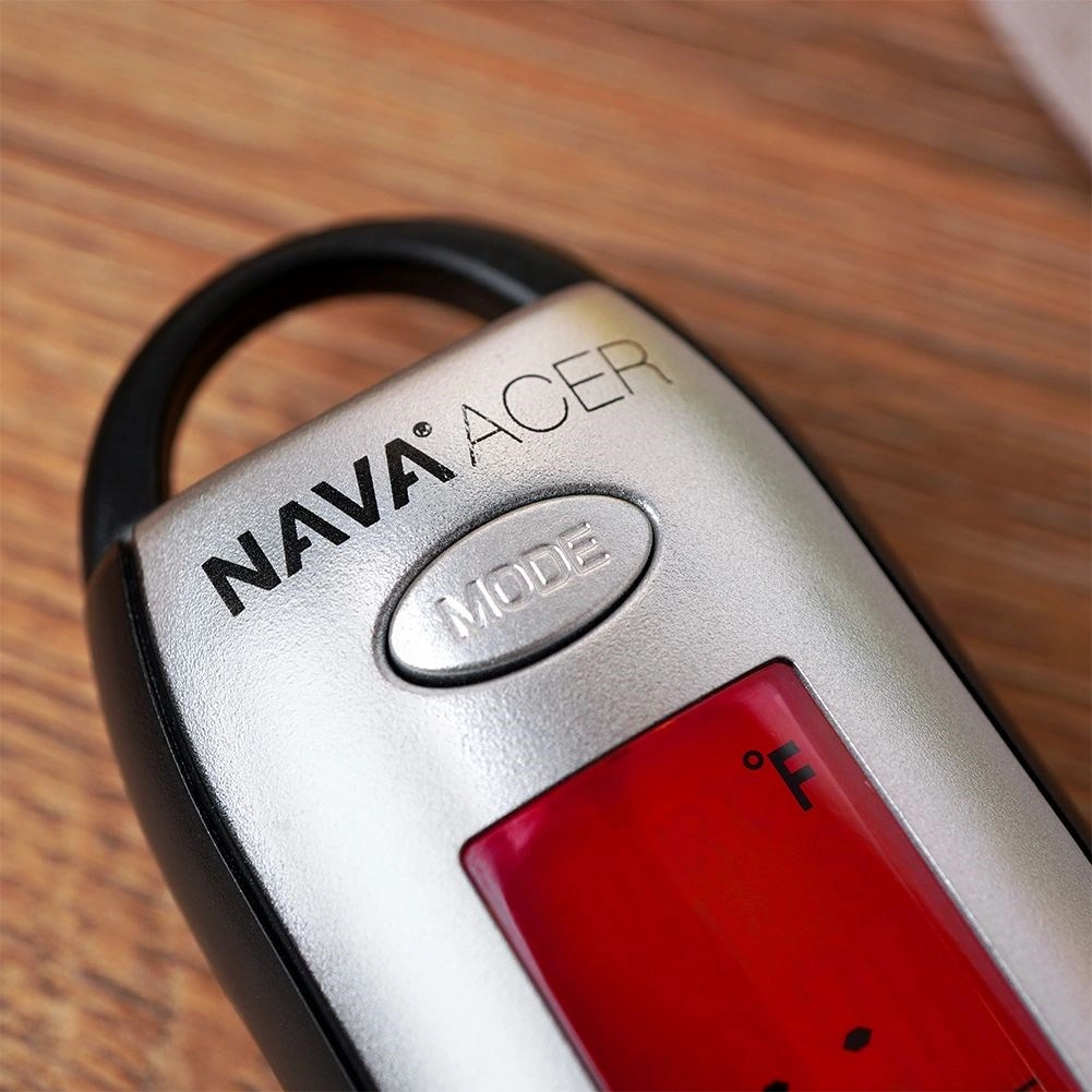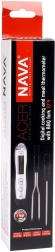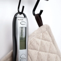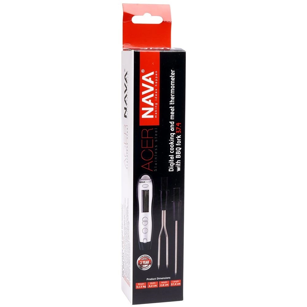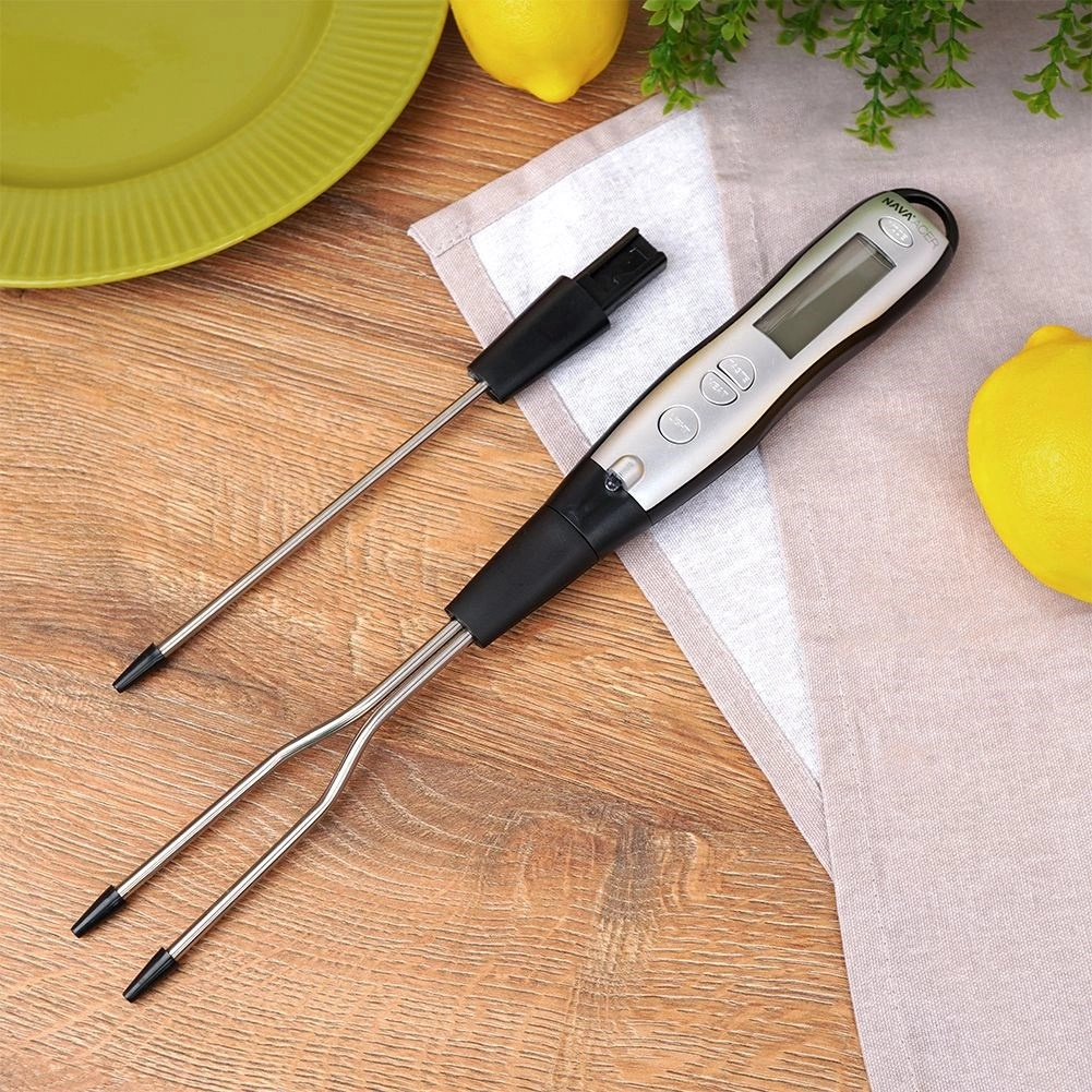 Termometrul digital de bucătărie ACER combină măsurarea precisă a temperaturii cu manevrarea comodă. Datorită celor două accesorii – sondă din oțel inoxidabil și furcă – măsurați cu ușurință temperatura internă a cărnii și a lichidelor și, în același timp, întoarceți în siguranță fripturile sau cârnații pe grătar. Ecranul iluminat asigură lizibilitate în orice condiții, iar mânerul ergonomic stă plăcut în mână.