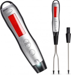 Termometrul oferă interval 0–100 °C (32–212 °F) cu pas de 1 °C/1 °F, 4 niveluri de gătire și 7 tipuri de carne pentru selecție ușoară, temporizator de 60 de minute cu alarmă acustică, lumină pentru lucrul la grătar și oprire automată după 1 minut. Capetele din oțel inoxidabil pot fi spălate în mașina de spălat vase, corpul este din plastic rezistent. Alimentare: 2× AAA 1,5 V (nu sunt incluse).