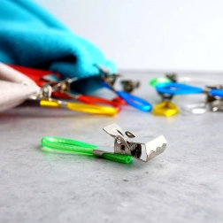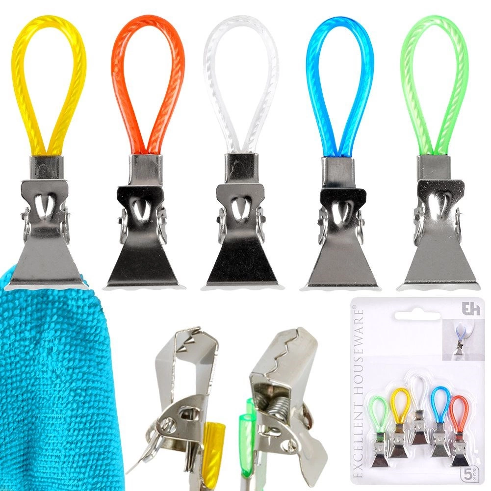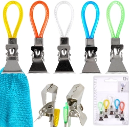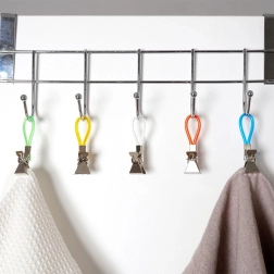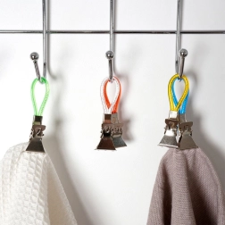 Descoperiți o modalitate simplă de a păstra prosoapele și lavetele mereu la îndemână și ordonat agățate. Clemele metalice cu bucle colorate permit agățarea rapidă pe cârlig, bară sau cuier și, datorită fălcilor zimțate, prind ferm chiar și țesăturile mai netede. Culorile diferite ale buclelor facilitează diferențierea prosoapelor pentru fiecare membru al familiei.