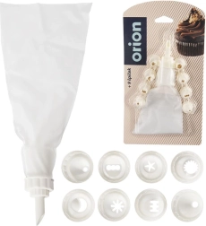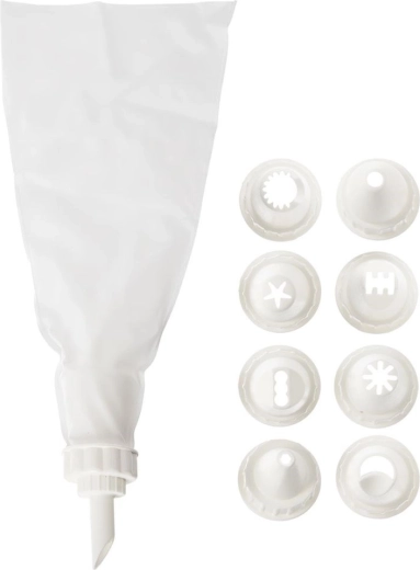 În pachet găsiți 9 capete diferite pentru steluțe, linii, puncte și motive florale. Soluția practică permite schimbarea rapidă a capetelor chiar în timpul lucrului – fără a scoate umplutura din pungă. Setul este grozav și pentru formarea bezelei, umplerea eclerelor sau decorarea gustărilor sărate.