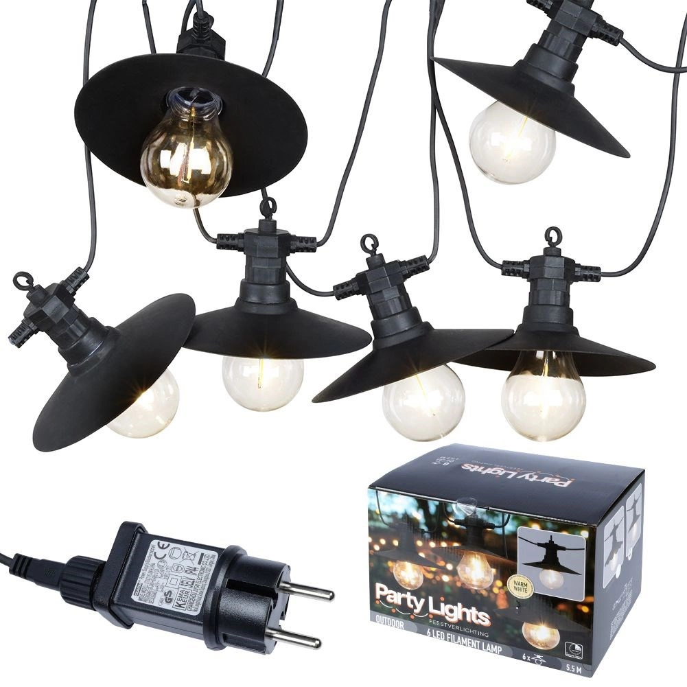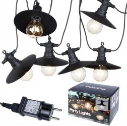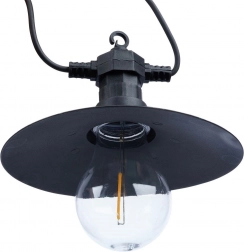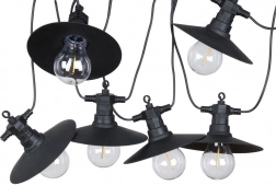 Această ghirlandă de exterior rezistentă combină abajururi elegante negre din metal (Ø 15 cm) cu becuri LED transparente (Ø 6 cm, lungime 7 cm), care direcționează lumina în jos și oferă o iluminare caldă și plăcută. Datorită distanței de 50 cm între becuri, luminează uniform zona de relaxare, foișorul sau petrecerile în grădină.