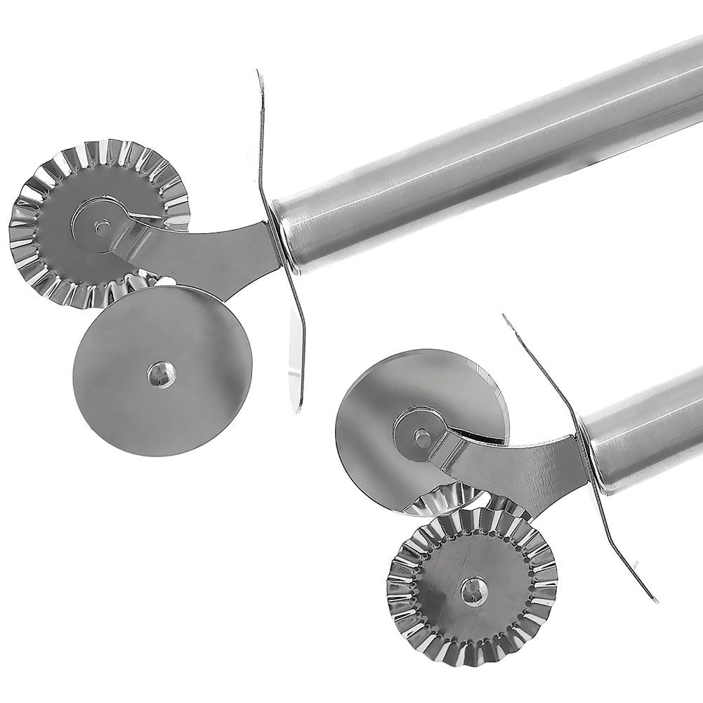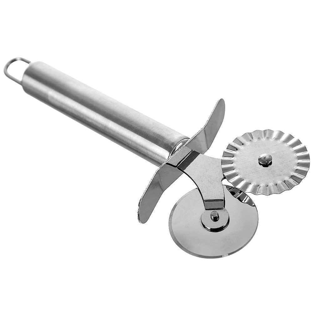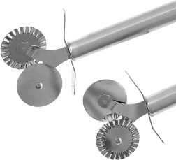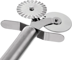 Practică roletă dublă din oțel inoxidabil, cu diametrul rotițelor de 4 cm și lungimea de 17 cm, pentru tăiere precisă a aluatului, pizzei sau pastelor. Oferă rotiță netedă pentru tăieturi drepte și rotiță ondulată pentru margini decorative, este ascuțită, rezistentă și compatibilă cu mașina de spălat vase.