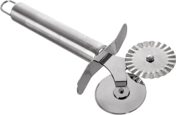 Roleta universală din oțel inoxidabil, cu două rotițe tăietoare, ușurează pregătirea pastelor de casă, a ravioli, biscuiților și a crakerilor sărați. Rotița netedă taie perfect drept, în timp ce rotița ondulată decorativă creează margini zimțate atractive și ajută la sigilarea marginilor aluatului pentru pachețele sau ravioli.