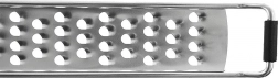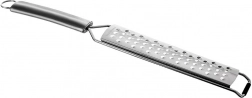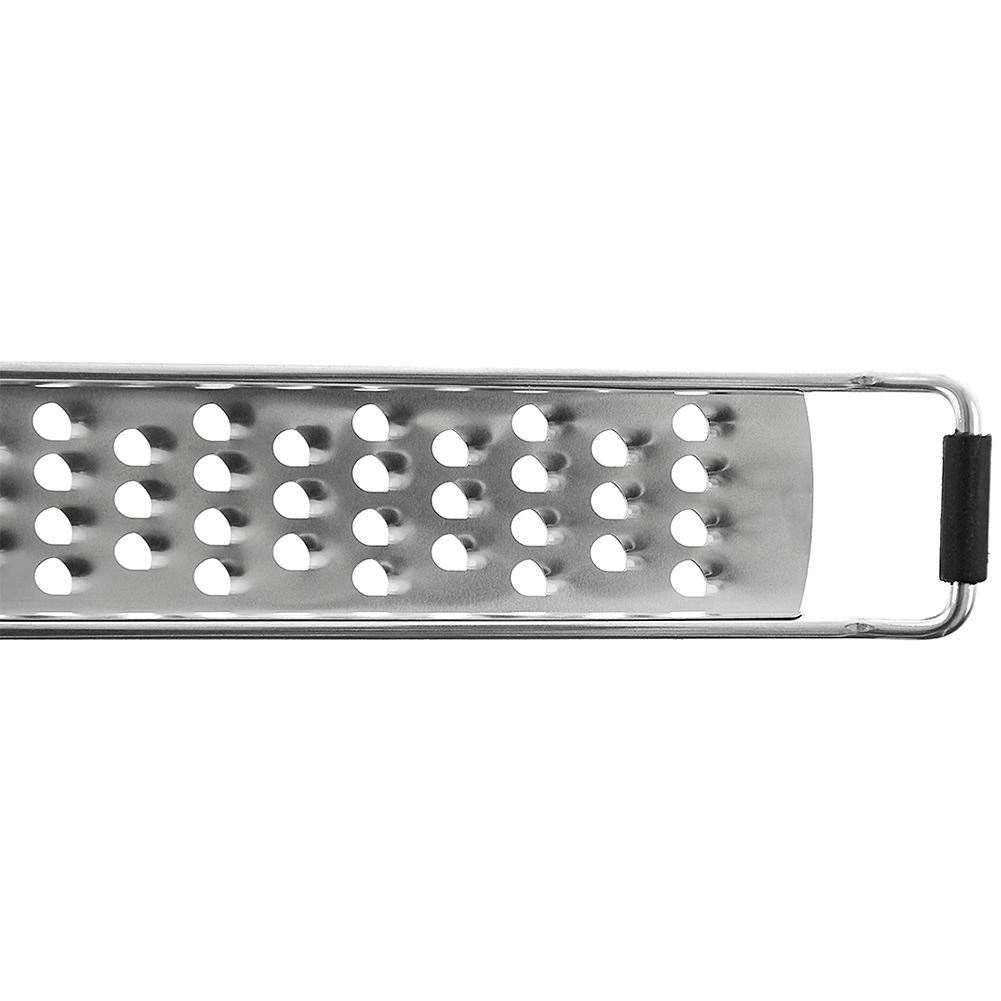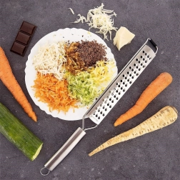 Răzătoarea practică din inox, cu lamă îngustă și plată și dinți ascuțiți, permite răzuirea rapidă și uniformă a ingredientelor în fulgi fini până la medii. Mânerul ergonomic lung asigură prindere sigură și control precis în timpul utilizării, iar piciorușul din cauciuc protejează oalele și tigăile împotriva zgârierii.