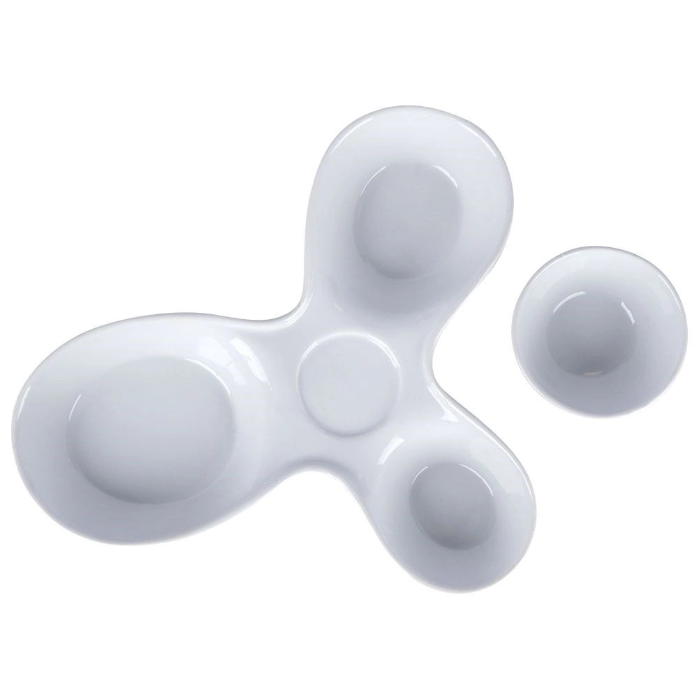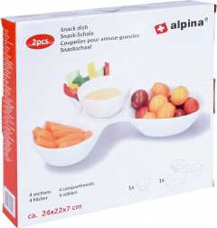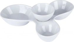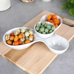 Set de servire stilat din ceramică de calitate, în culoare albă, ideal pentru servirea nucilor, fructelor uscate, legumelor, dipurilor sau sosurilor. Trei boluri interconectate și un bol detașabil permit servirea diferitelor gustări separat, astfel încât să nu se amestece aromele. Dimensiunile compacte de 26 × 22 × 6,5 cm se potrivesc pe orice masă sau tavă.