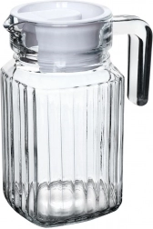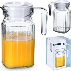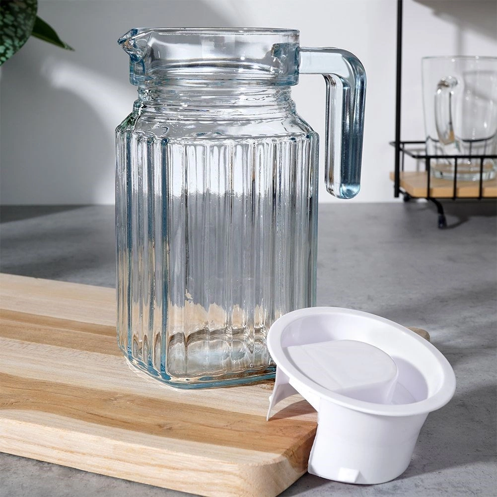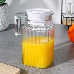 Această carafă din sticlă îmbină designul atemporal cu practicitatea pentru utilizarea zilnică. Sticla transparentă, rezistentă, cu striații verticale, asigură o priză sigură și un aspect atractiv. Capacul alb practic protejează băuturile și menține curățenia la servire, atât acasă, cât și în aer liber.
