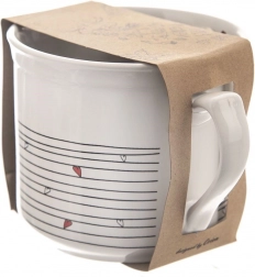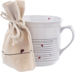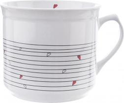 Ceramică albă de calitate cu decor de inimioare, potrivită pentru mașina de spălat vase și cuptorul cu microunde. Baza plată permite încălzirea băuturilor și pe plită.