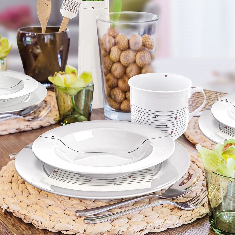 - Porțelan de calitate – suprafață solidă, netedă și glazură albă elegantă cu motiv fin de inimă.