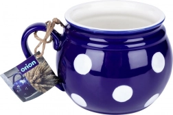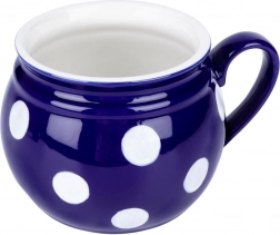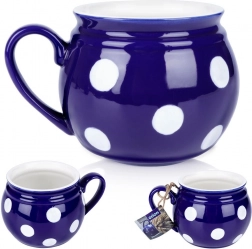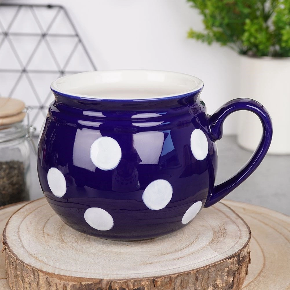 Bucură-te de băuturile preferate în stil mare. Această cană ceramică de 850 ml este o alegere excelentă pentru cei care preferă porții mai mari de ceai, cafea sau infuzii din plante. Forma clasică tip butoi, glazura albastru închis și bulinele albe mari aduc un plus de stil mesei și se asortează perfect cu alte piese de veselă.