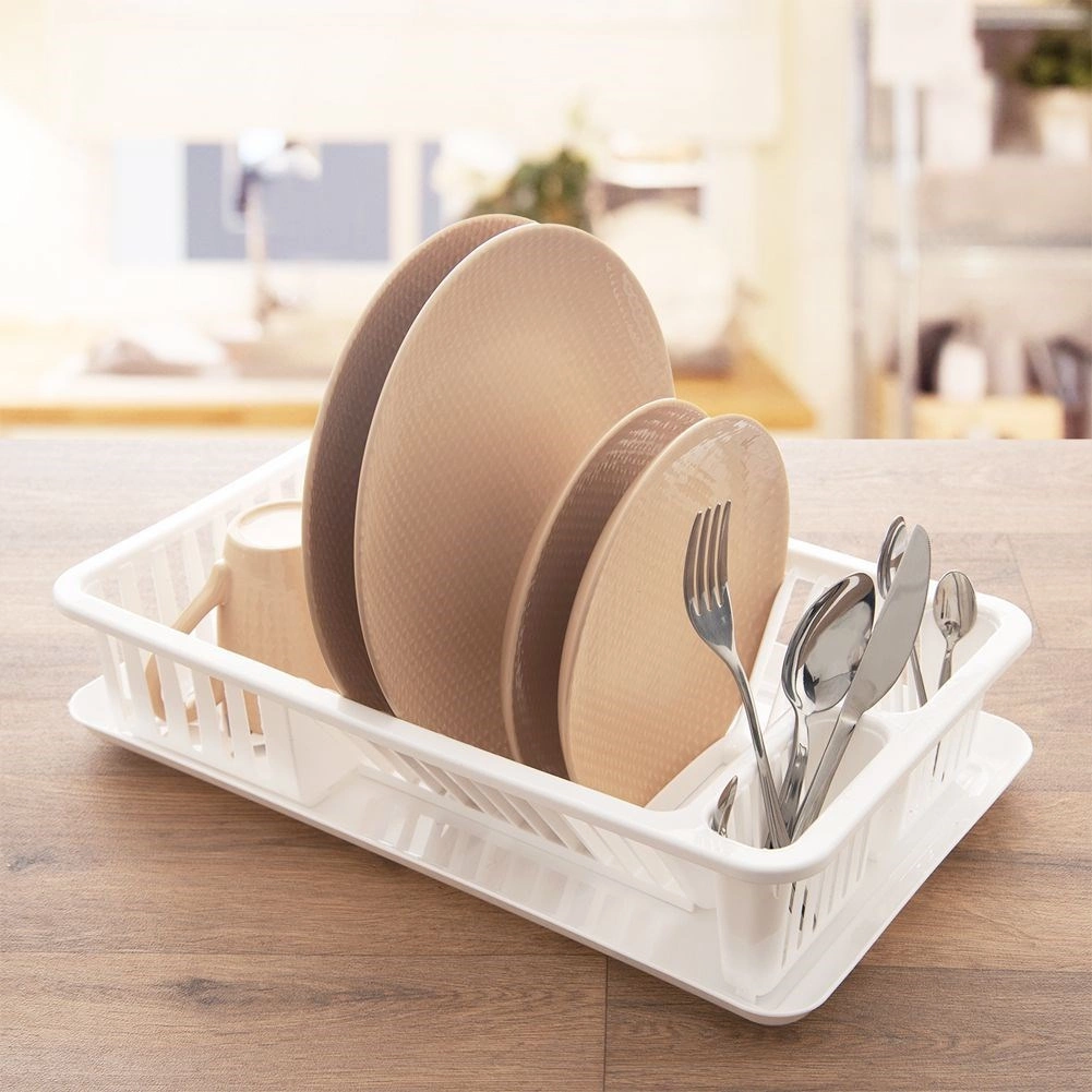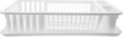 Păstrați ordinea lângă chiuvetă și accelerați uscarea vaselor cu un suport compact care îmbină funcționalitatea cu un aspect curat și universal. Plasticul alb este ușor de întreținut, iar tava detașabilă colectează apa, astfel încât protejează blatul de lucru împotriva umezelii și petelor.