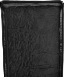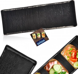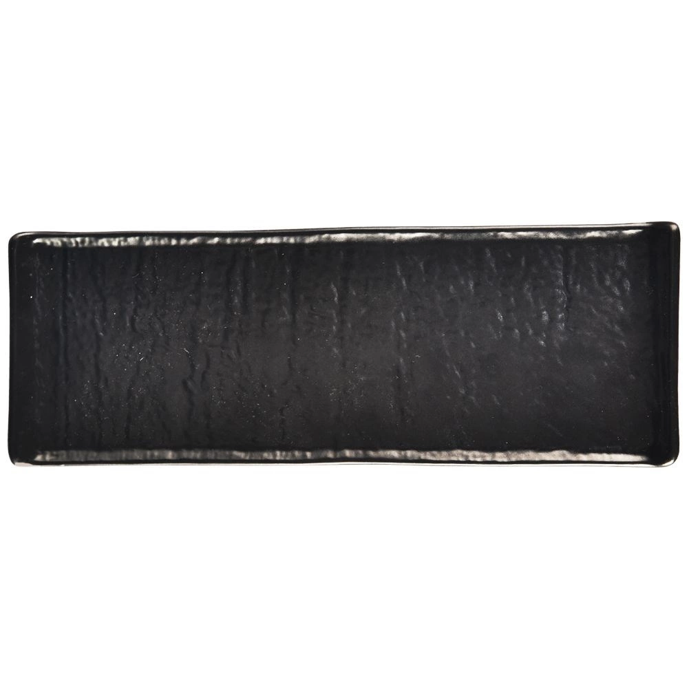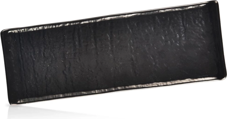 Forma dreptunghiulară alungită, glazurarea neagră și textura fină a suprafeței conferă fiecărei prezentări un aspect profesional.