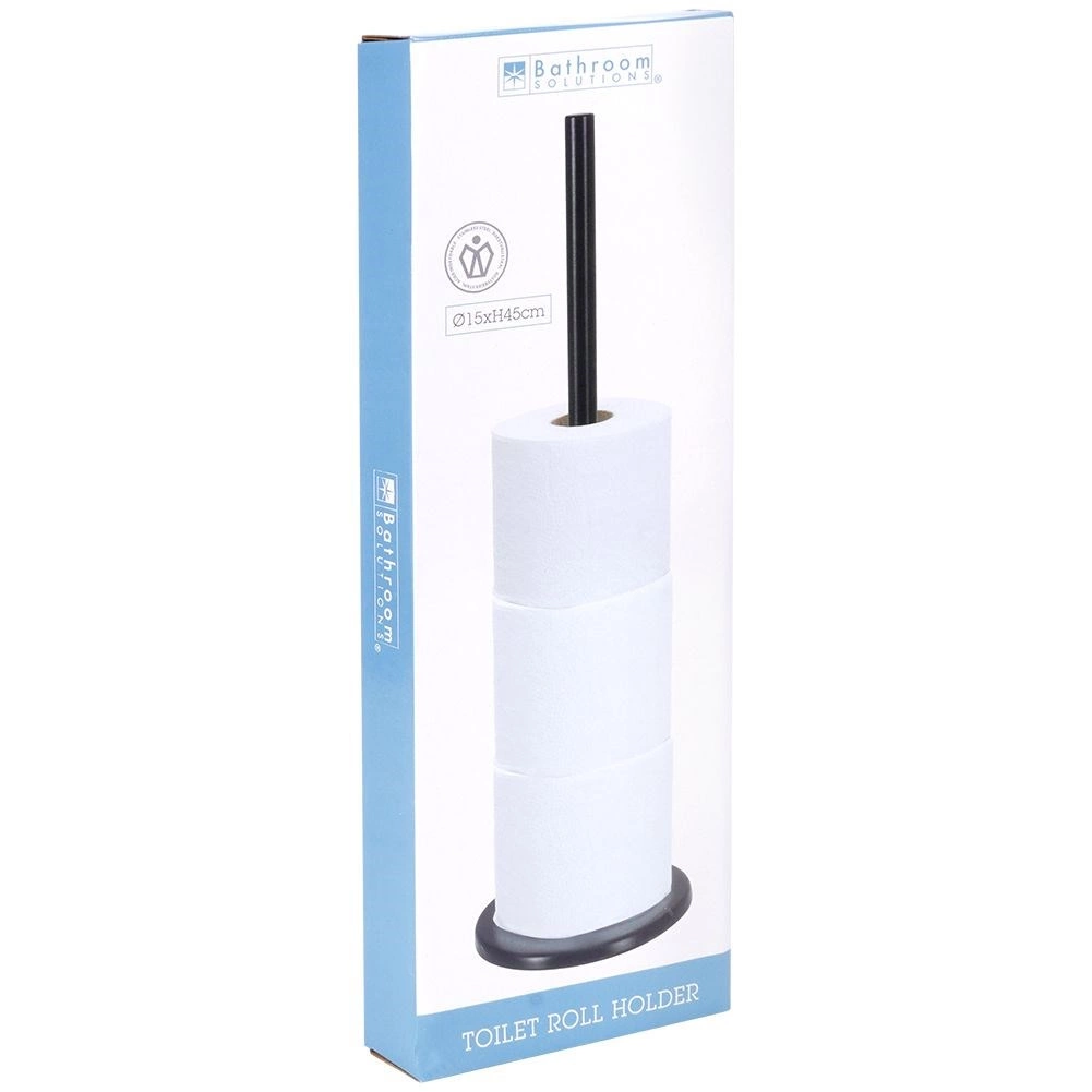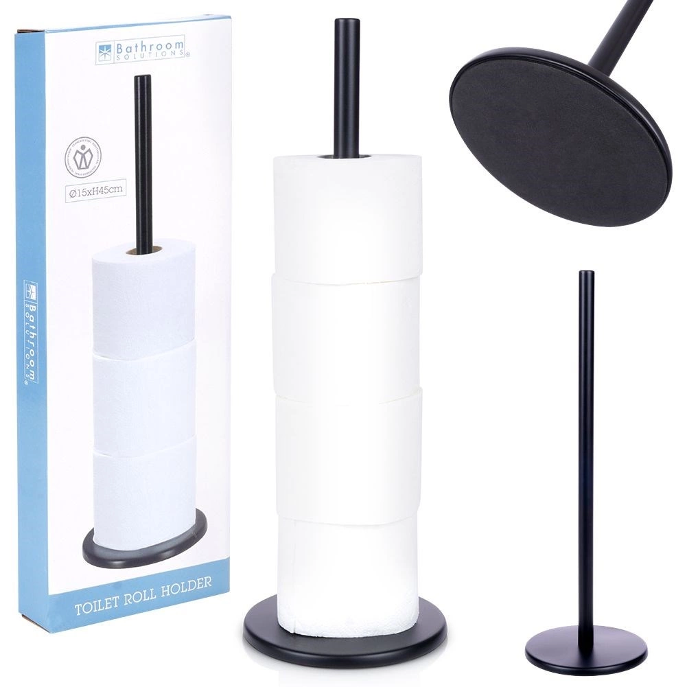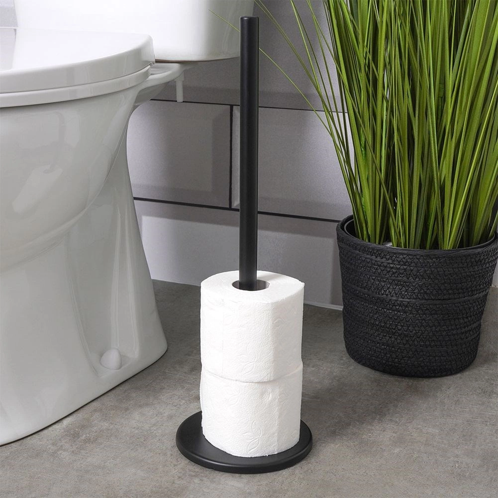 Suportul liber pentru hârtie igienică, cu înălțimea de 47 cm și diametrul bazei de 15 cm, oferă o soluție practică și elegantă pentru orice toaletă. Designul minimalist în negru mat se potrivește perfect cu majoritatea stilurilor de baie și păstrează rolele de rezervă mereu la îndemână.