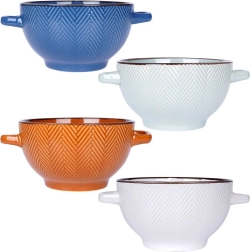 Bolurile, în culori armonioase (alb, albastru, portocaliu/maro deschis și gri), au un relief stil pește/chevron și o margine contrastantă, ceea ce le face să arate excelent pe orice masă. Sunt perfecte nu doar pentru supe și creme, ci și pentru cereale, iaurt, fructe, salate sau gustări sărate și dulci.