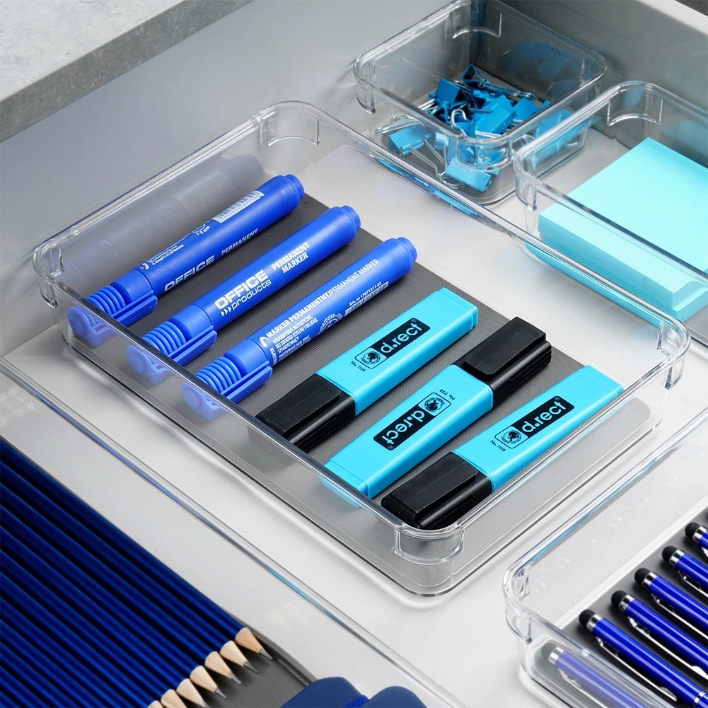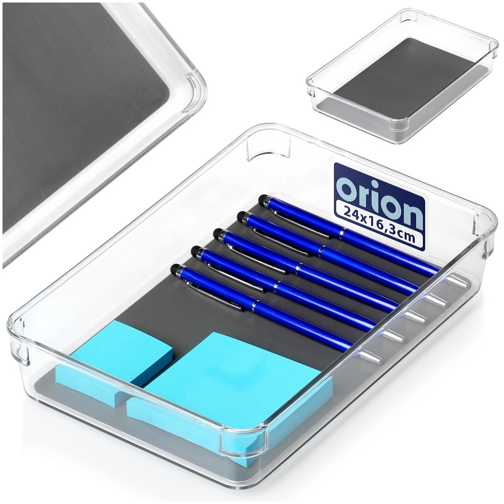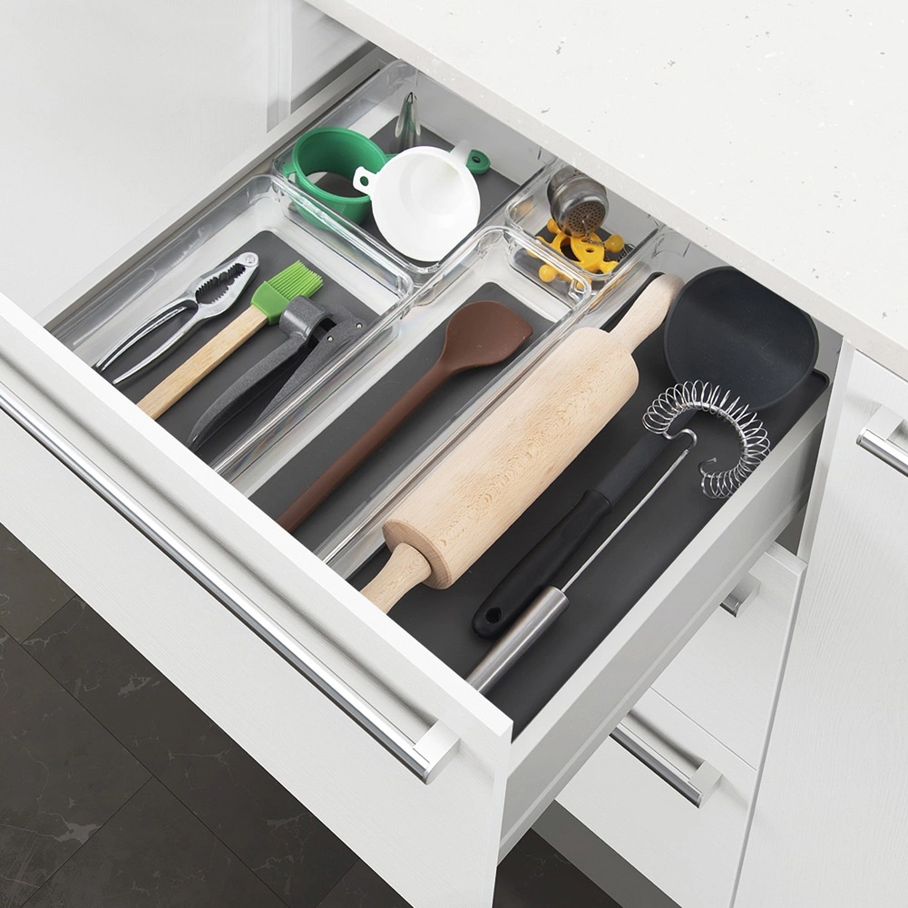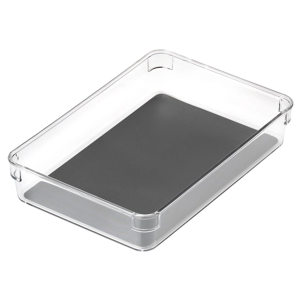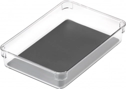 Tava de depozitare GREY este un organizator durabil, transparent, cu inserție TPE detașabilă, care împiedică alunecarea obiectelor și facilitează curățarea. Picioarele antiderapante asigură stabilitate în sertar și pe raft, astfel încât nu se deplasează nici la deschiderea sertarului.