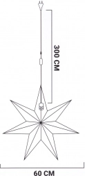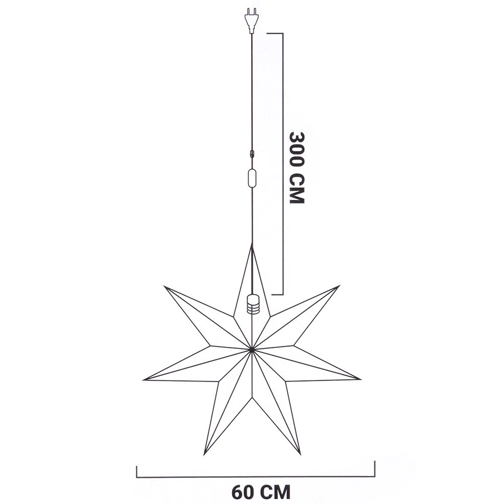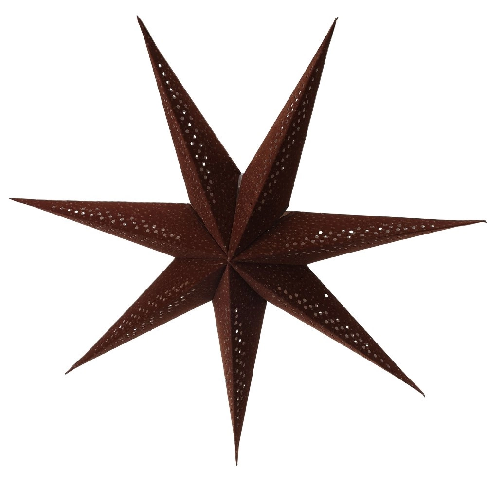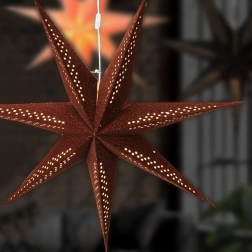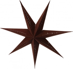Stea suspendată elegantă cu diametrul de 60 cm, din hârtie rigidă, cu suprafață catifelată în culoare maro și detalii aurii sclipitoare. Odată aprinsă, creează o lumină delicată, de atmosferă, oferind interiorului un farmec atât festiv, cât și potrivit pe tot parcursul anului. Se alimentează de la rețea, are întrerupător, cablu de 3 m și este concepută pentru bec E14 (max. 25 W, nu este inclus). Ideală pentru fereastră, perete sau oriunde doriți să subliniați o ambianță primitoare.