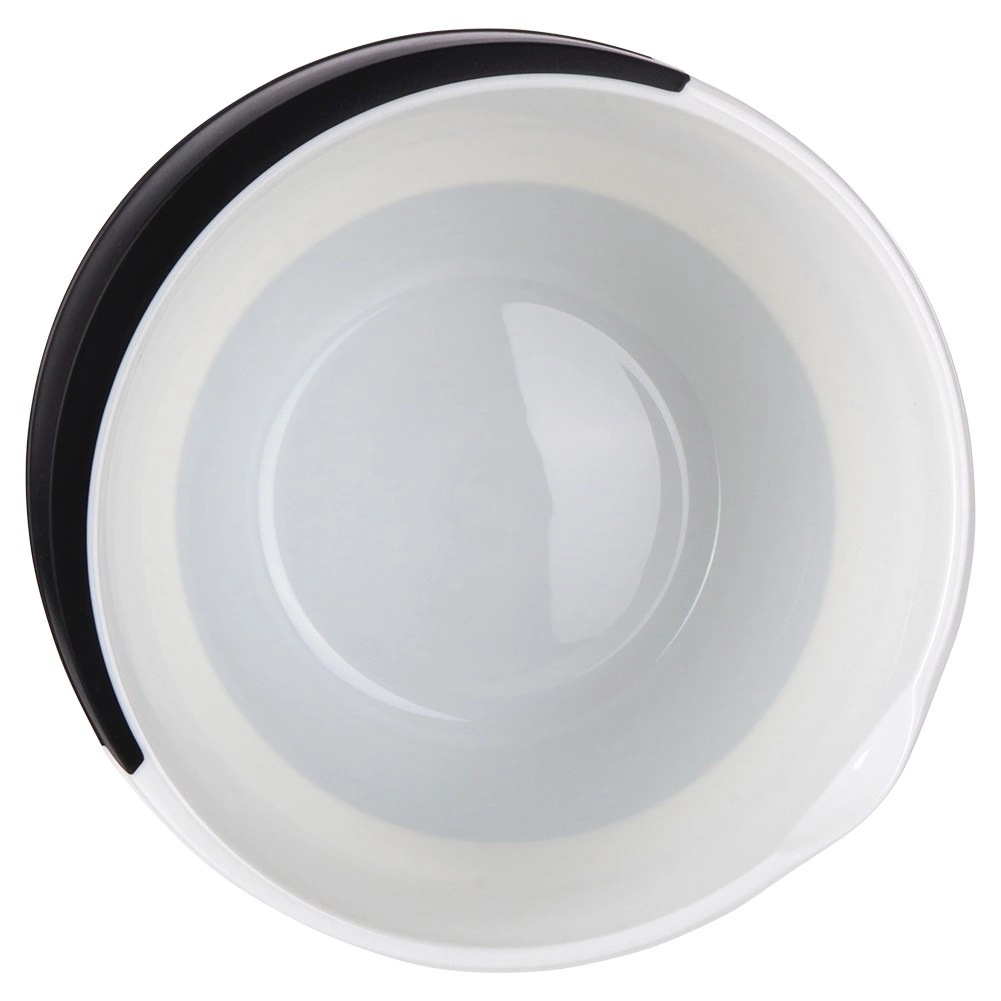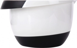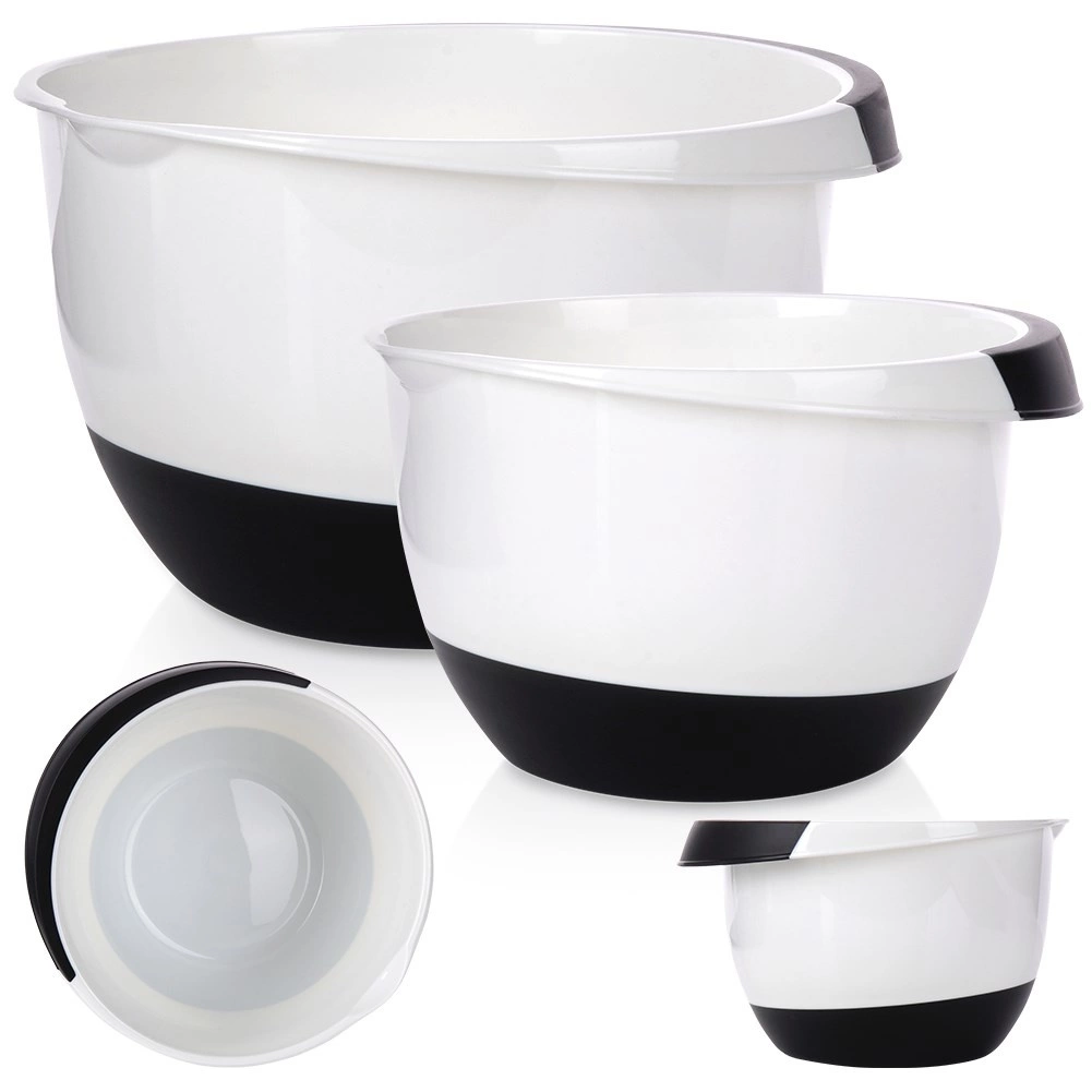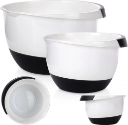 Set universal de boluri de bucătărie, culoare albă cu baze negre antiderapante pentru stabilitate maximă pe blatul de lucru. Datorită mânerelor și gurei de turnare integrate, turnarea aluatului sau a sosurilor este curată și precisă. Bolurile se întrețin ușor, sunt foarte ușoare și totodată rezistente, fiind potrivite pentru gătitul și coptul zilnic.