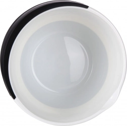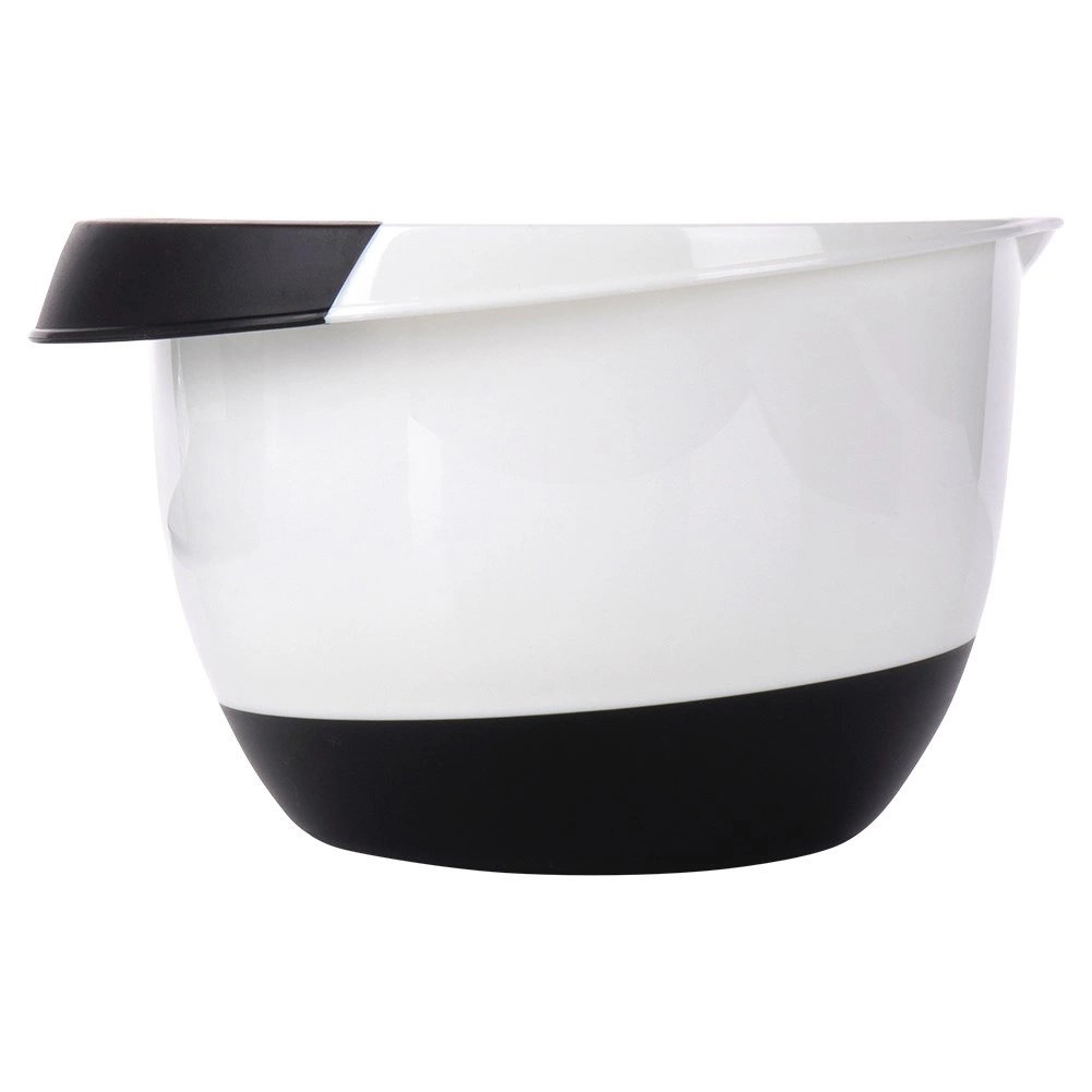 Baza neagră din cauciuc previne alunecarea pe blatul de lucru, iar mânerele laterale facilitează manipularea chiar și când bolul este plin.