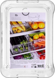 Organizator practic transparent pentru frigider, cu dimensiunile 27 × 19 × 11,5 cm, ajută la menținerea alimentelor ordonate și ușor de găsit. Datorită mânerelor integrate se transportă și se scoate ușor de pe rafturi. Fabricat din plastic rezistent, sigur pentru contactul cu alimentele, potrivit și pentru mașina de spălat vase. Ideal pentru fructe, legume și alte obiecte de bucătărie. Design transparent, construcție solidă, întreținere ușoară și mânere confortabile pentru utilizare zilnică.