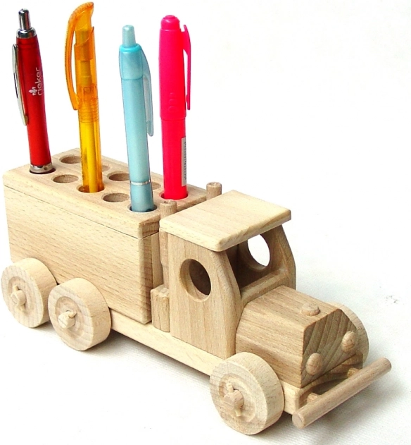 Aduce ordine pe biroul copiilor și al adulților cu suportul original în formă de camion. Este realizat din lemn de fag de primă clasă, iar suprafața este doar ceruită și lustruită, fără tratamente chimice și vopsire – astfel își păstrează aspectul natural și mirosul lemnului. Roțile pivotante și margini rotunjite asigură o utilizare sigură și distractivă.