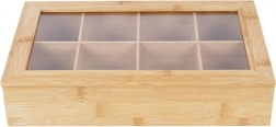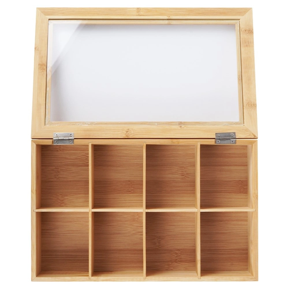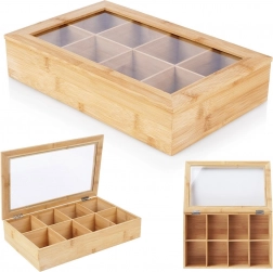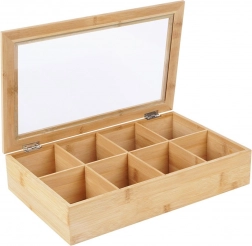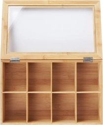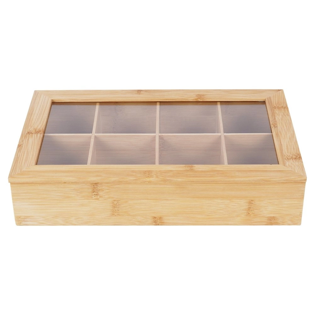 Această casetă de ceai din bambus, stilată, oferă o soluție inteligentă și estetică pentru depozitarea plicurilor de ceai. Datorită celor opt compartimente separate, organizați ușor diferitele tipuri și arome de ceai. Capacul transparent permite o verificare rapidă a conținutului fără a deschide cutia.