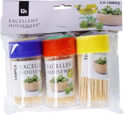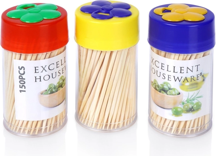 Setul conține 3 dozatoare transparente, fiecare cu 150 de scobitori din bambus de calitate. Materialul natural este rezistent, neted și sigur pentru contactul cu alimentele. Datorită capacului dozator, utilizarea este rapidă, curată și organizată.