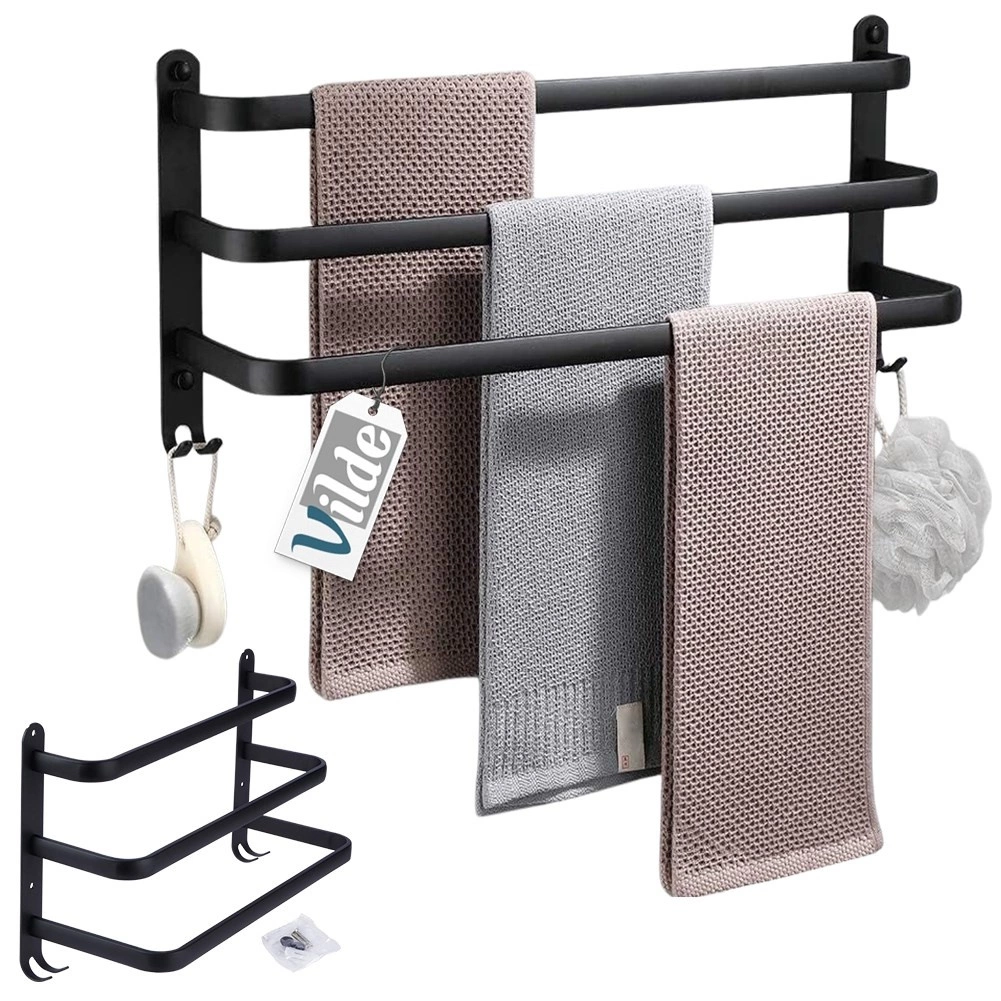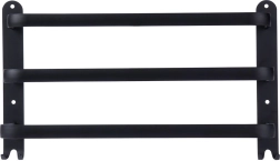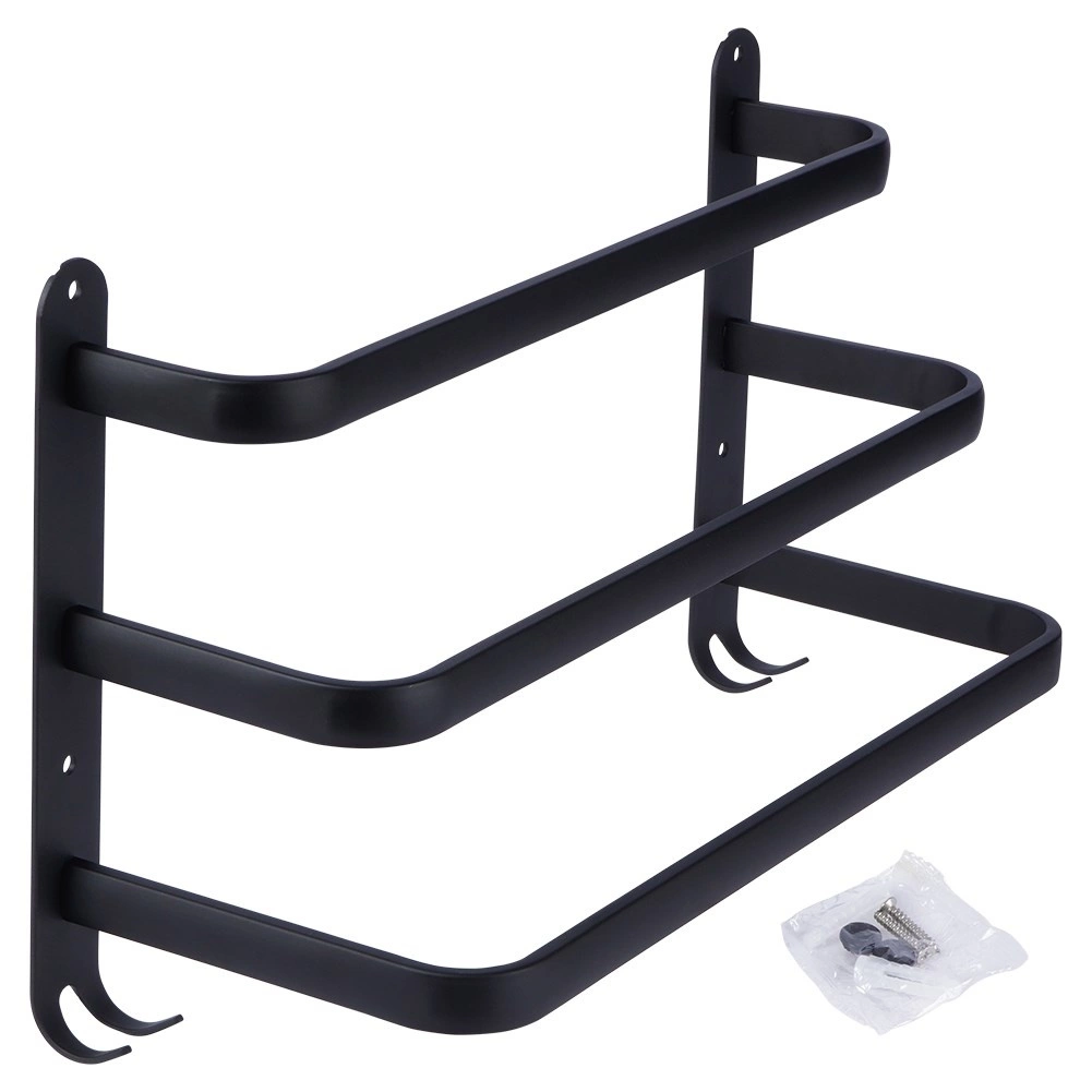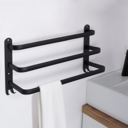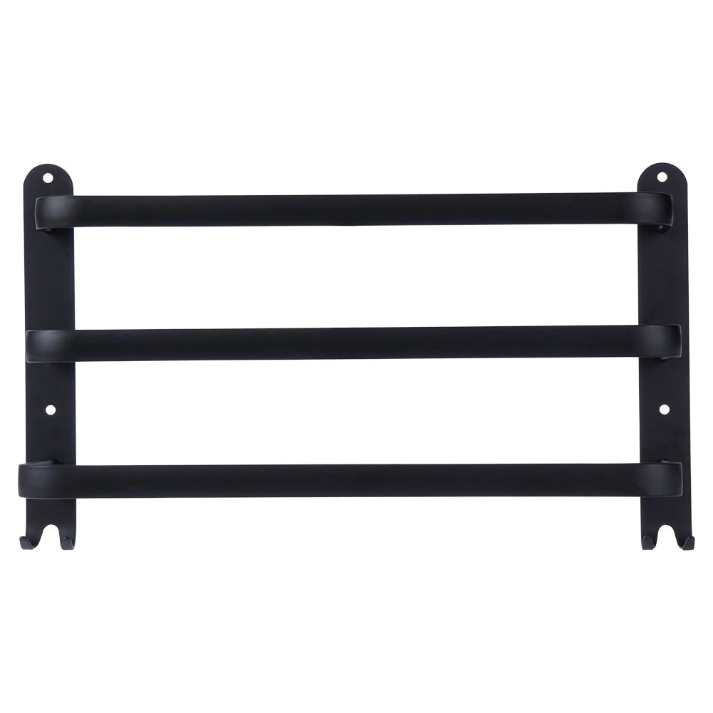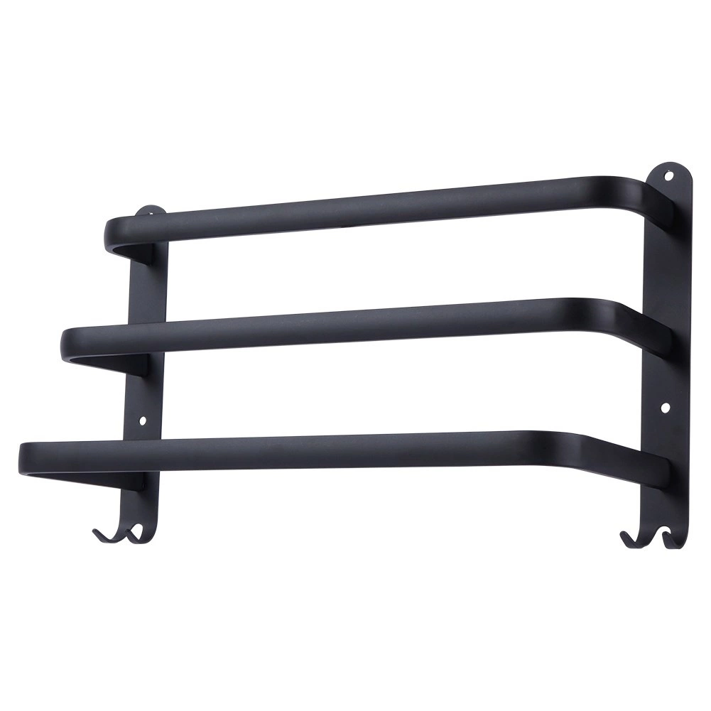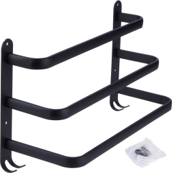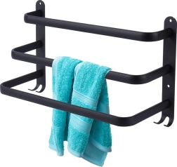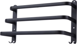 Suport de prosoape stilat și rezistent pentru o organizare clară a băii tale. Trei bare orizontale asigură uscarea și aerisirea eficientă a prosoapelor, în timp ce cele patru cârlige din partea de jos oferă loc pentru mănuși de baie sau accesorii. Designul minimalist în negru mat evidențiază interioarele în stil scandinav, modern și loft.