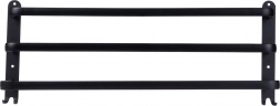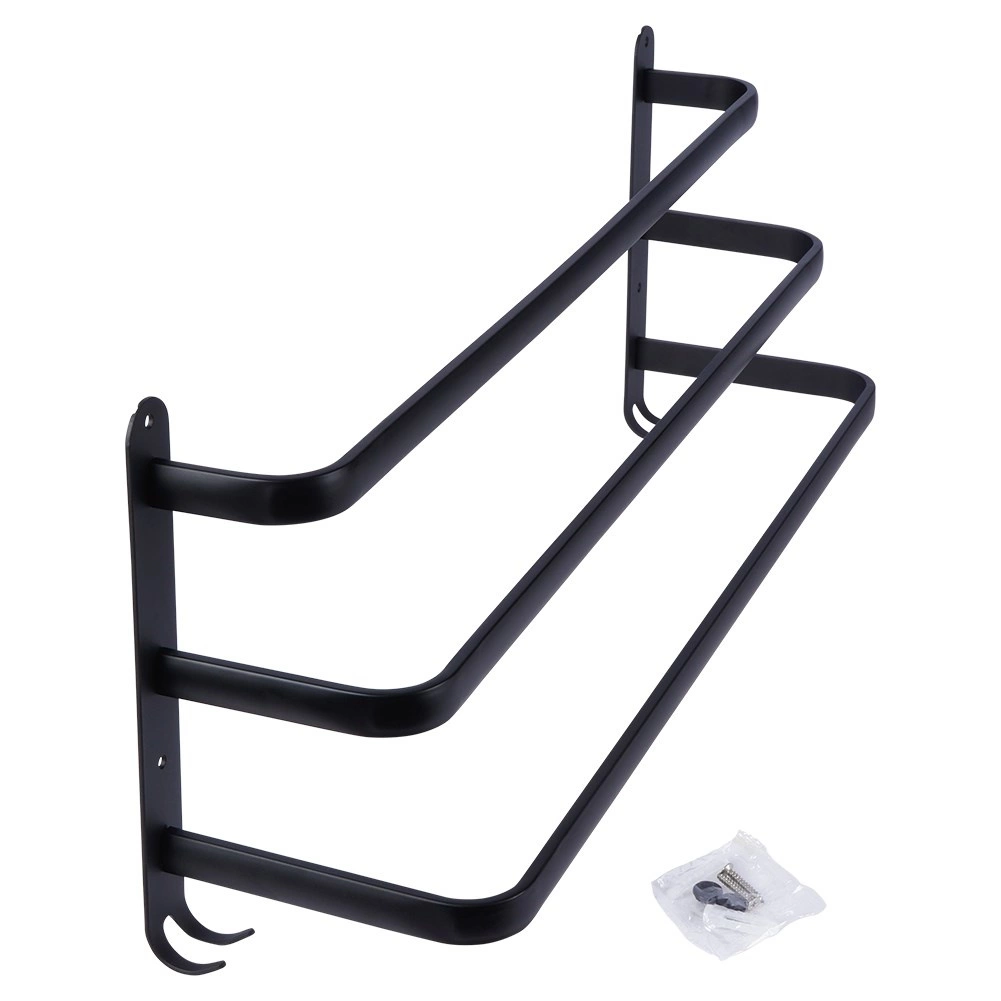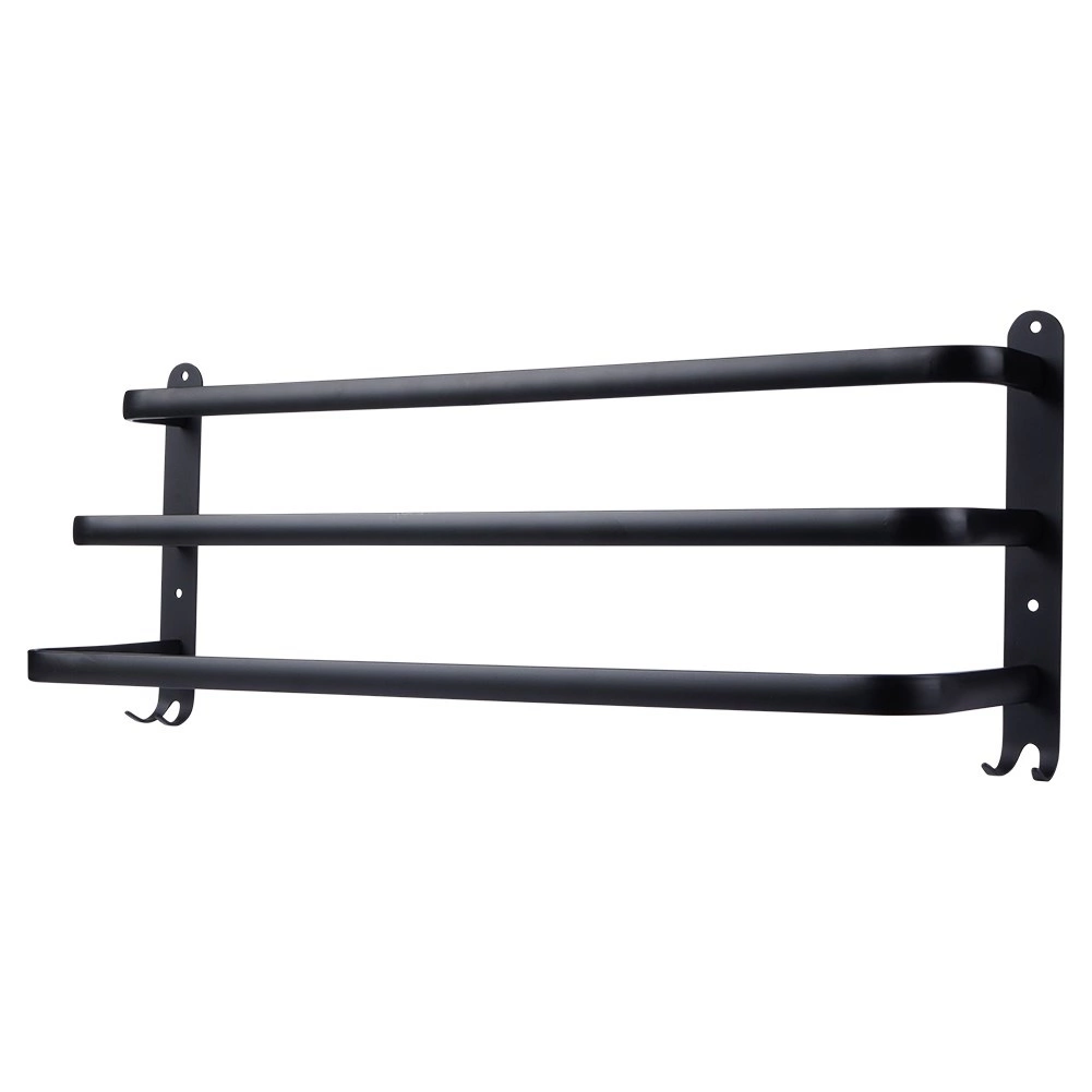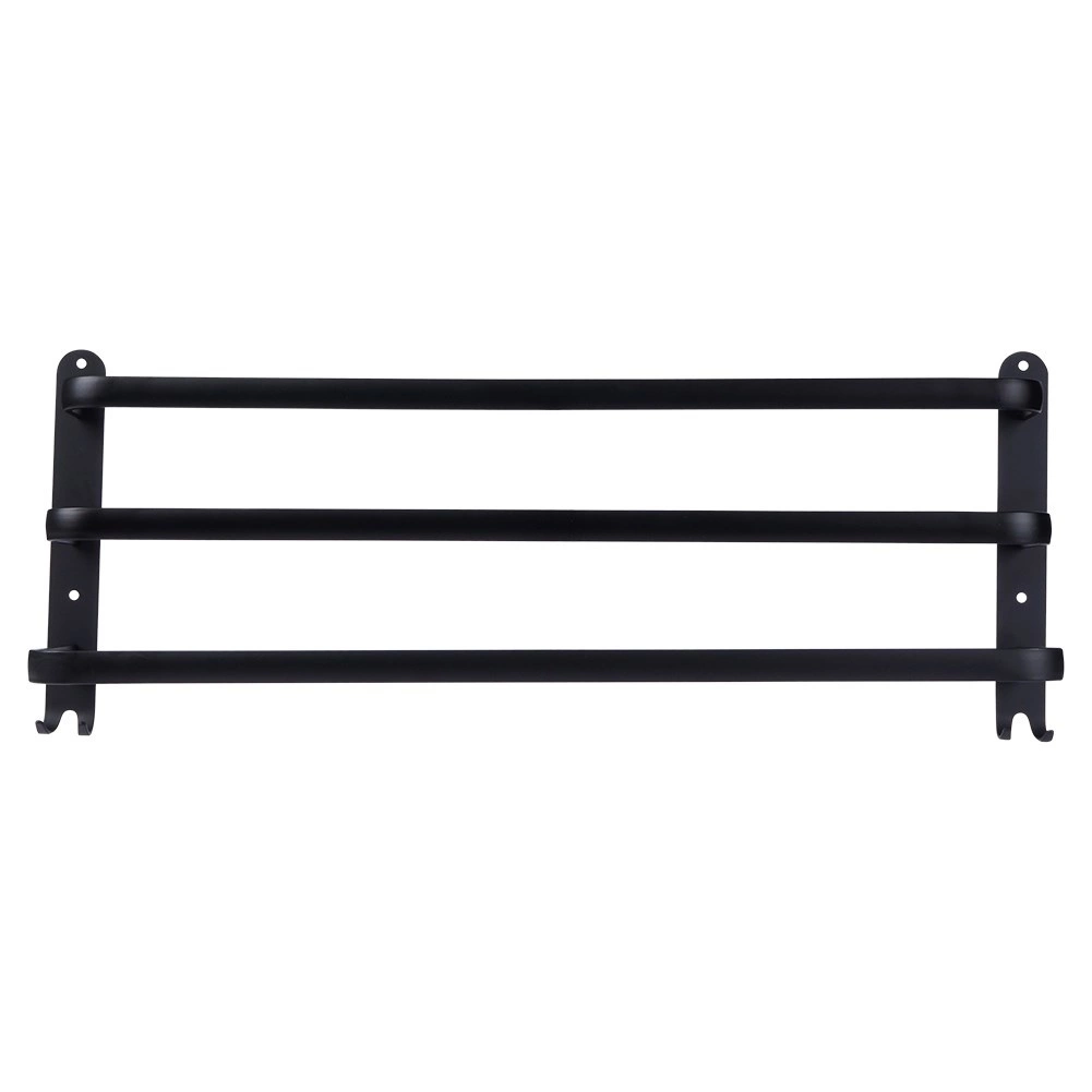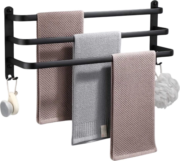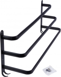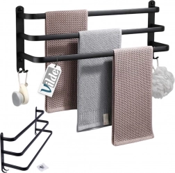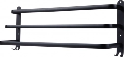 Suport practic și elegant pentru prosoape, cu trei brațe paralele, oferă suficient spațiu pentru uscare și organizare. Cele patru cârlige inferioare sunt utile pentru bureți, perii sau alte accesorii de baie. Execuția durabilă în negru mat evidențiază băile moderne, industriale sau clasice.