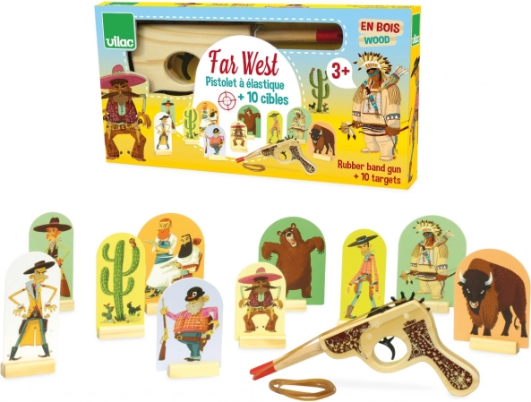 Trăiește atmosfera Vestului Sălbatic cu acest pistol din lemn cu ținte de la VILAC. Jocul este ideal pentru copii de la 3 ani și ajută la antrenarea preciziei, a concentrării și a motricității fine. Doar întinde elasticul, așază țintele și începe să tragi – distracție pentru toată familia.