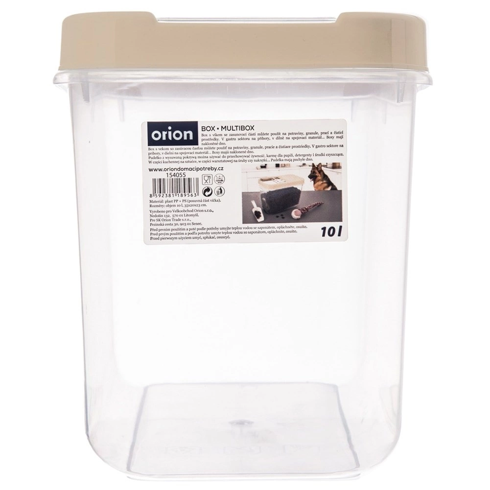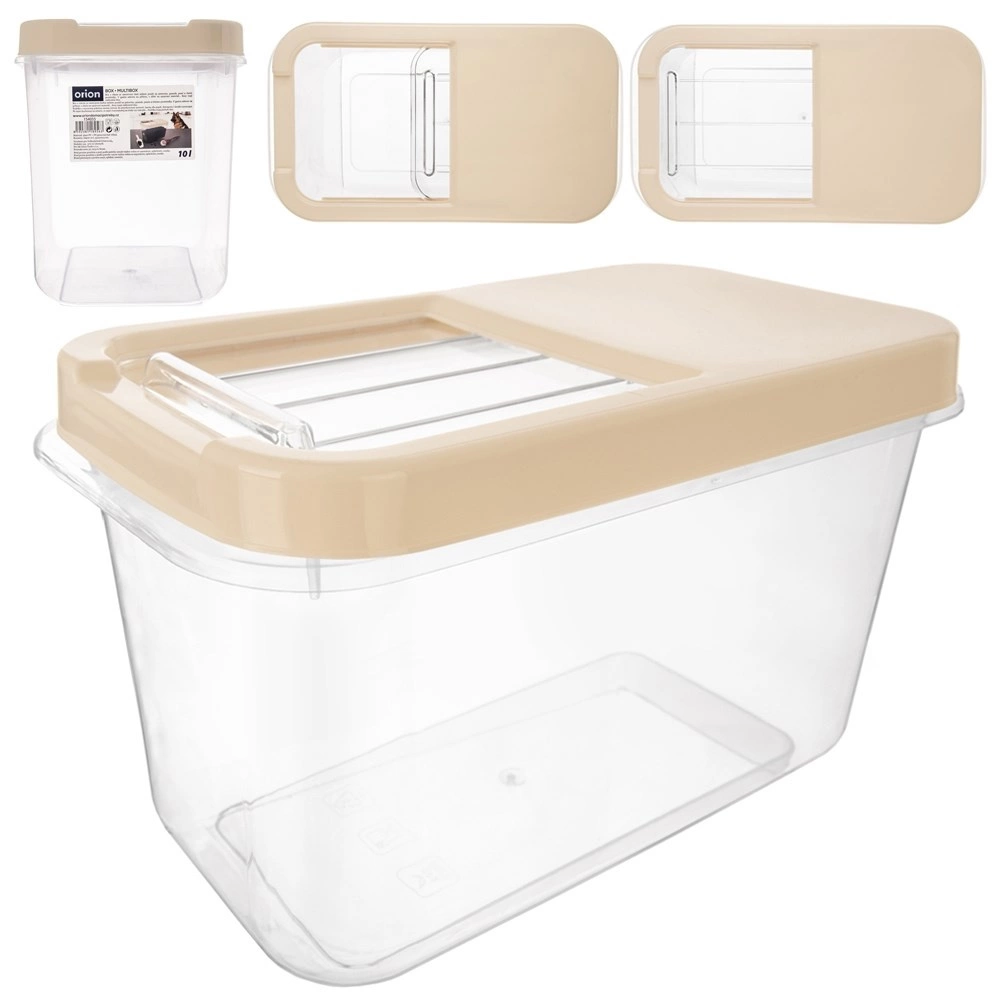 Recipient practic de 10 l cu corp transparent și capac glisant în culoare bej pentru dozare ușoară. Potrivit pentru alimente uscate, capsule și pudră de spălat, hrană pentru animale de companie și mici accesorii pentru casă. Fabricat din plastic sigur, fără BPA, se întreține ușor și, datorită pereților transparenți, vezi mereu conținutul.