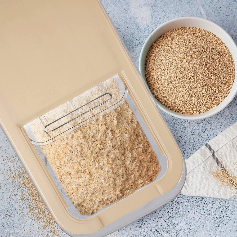 Fereastra glisantă integrată în capac permite dozarea conținutului fără a deschide întregul recipient – ideal pentru utilizare zilnică în bucătărie și cămară.