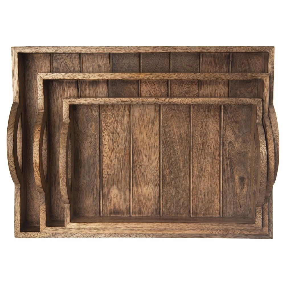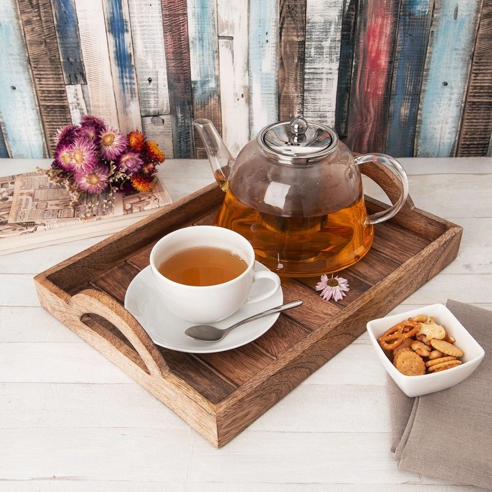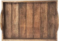 Tava dreptunghiulară de servire din lemn de mango se remarcă prin rezistență, durabilitate la umiditate și fibra naturală a lemnului. Datorită mânerelelor integrate, este ușor de transportat cafeaua, ceaiul, deserturile sau chiar mic dejunul complet. Suporții antiderapanți de pe partea inferioară protejează masa și asigură stabilitatea.